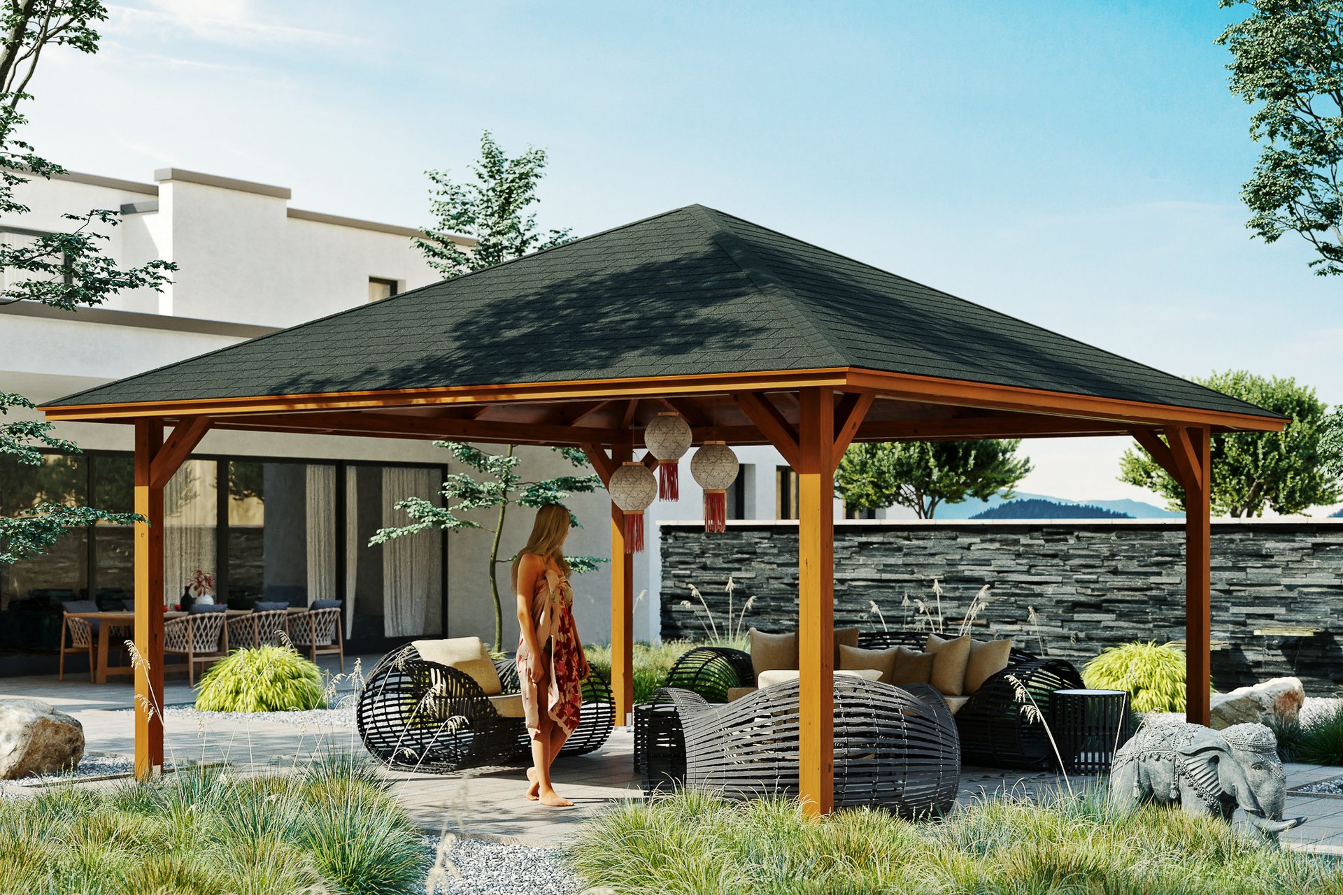 • Außenmaße 569 x 569 cm • massive Konstruktion aus hochwertigem Leimholz (BSH-Fichte) • farblich behandelt in nussbaum • Pfosten 12 x 12 cm inklusive Aufschraubstützen • gezapfte Pfosten-Pfetten-Verbindungen • gekervte Sparren • abgeschrägte Gratsparren • 20 mm Dachschalung • Dachschindeln als Zubehör erhältlich