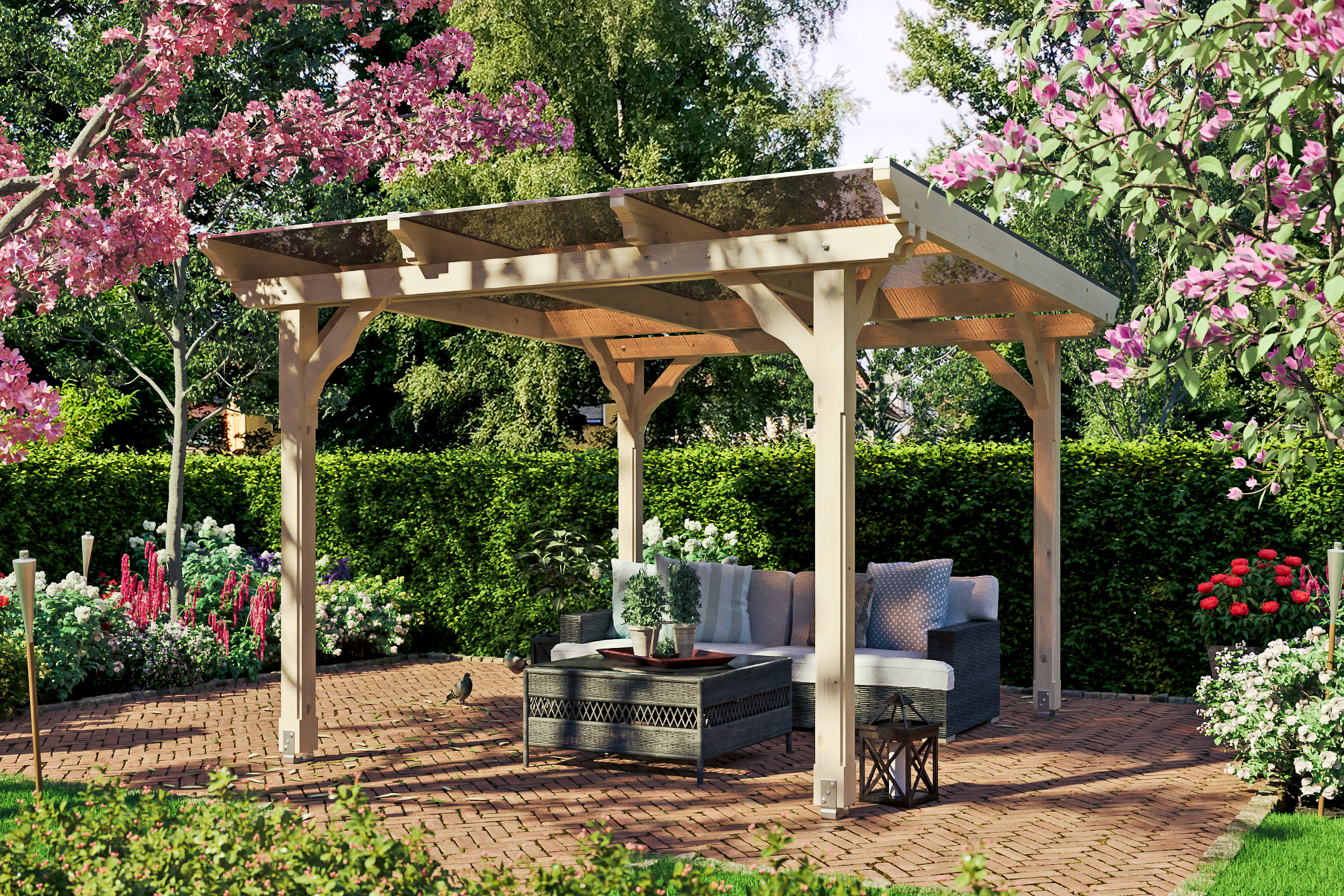 • Außenmaße 327 x 350 cm • massive Konstruktion aus hochwertigem Leimholz (BSH-Fichte) • farblich unbehandelt • Pfosten 12 x 12 cm inklusive Aufschraubstützen • aufwendige Verzierungen der Pfosten, Kopfbänder sowie der Sparren- und Pfettenenden • Dacheindeckung 10 mm Polycarbonat-Doppelstegplatten in bronze