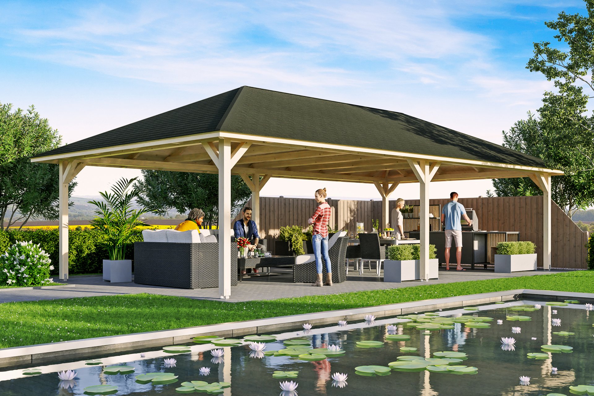 • Außenmaße 569 x 1046 cm • massive Konstruktion aus hochwertigem Leimholz (BSH-Fichte) • farblich unbehandelt • Pfosten 12 x 12 cm inklusive Aufschraubstützen • gezapfte Pfosten-Pfetten-Verbindungen • gekervte Sparren • abgeschrägte Gratsparren • 20 mm Dachschalung • Dachschindeln als Zubehör erhältlich