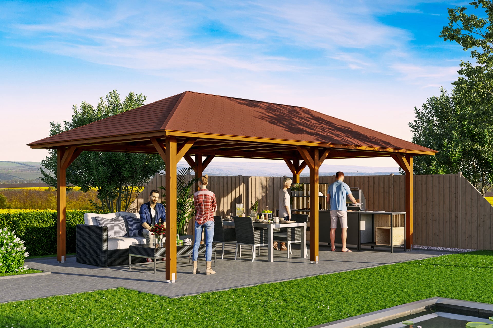 • Außenmaße 439 x 786 cm • massive Konstruktion aus hochwertigem Leimholz (BSH-Fichte) • farblich behandelt in nussbaum • Pfosten 12 x 12 cm inklusive Aufschraubstützen • gezapfte Pfosten-Pfetten-Verbindungen • gekervte Sparren • abgeschrägte Gratsparren • 20 mm Dachschalung • Dachschindeln als Zubehör erhältlich