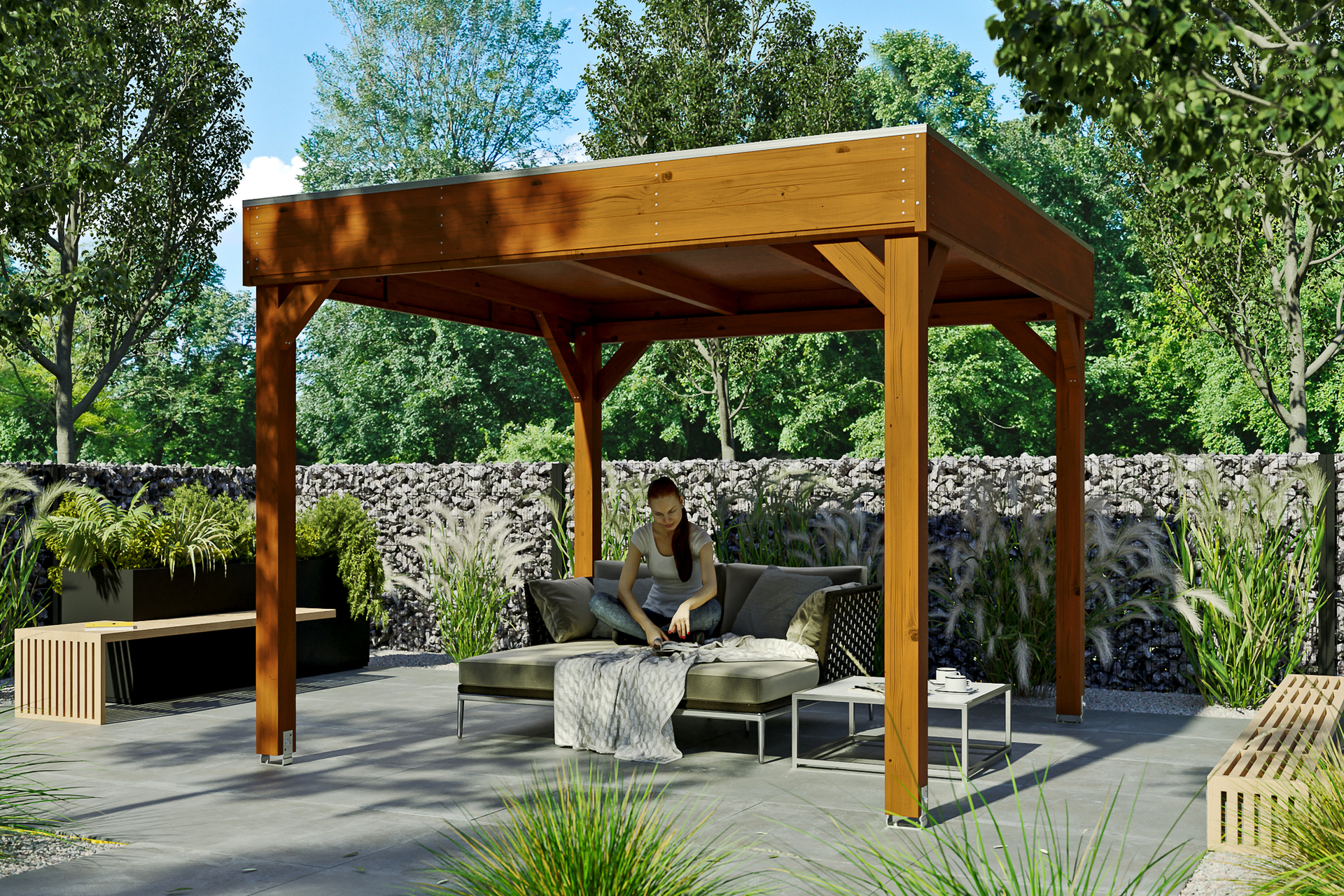 Das Dach besteht aus 19 mmDachschalung und einer Aluminium-Abschlusskante. Aufgrund der geringen Dachneigung ist eine Eindeckung mit Dachschindeln nicht möglich. Wir empfehlen die Eindeckung mit KSK-M Dachbahnen (sind optional als Zubehör erhältlich). Das Gefälle verläuft nach hinten.