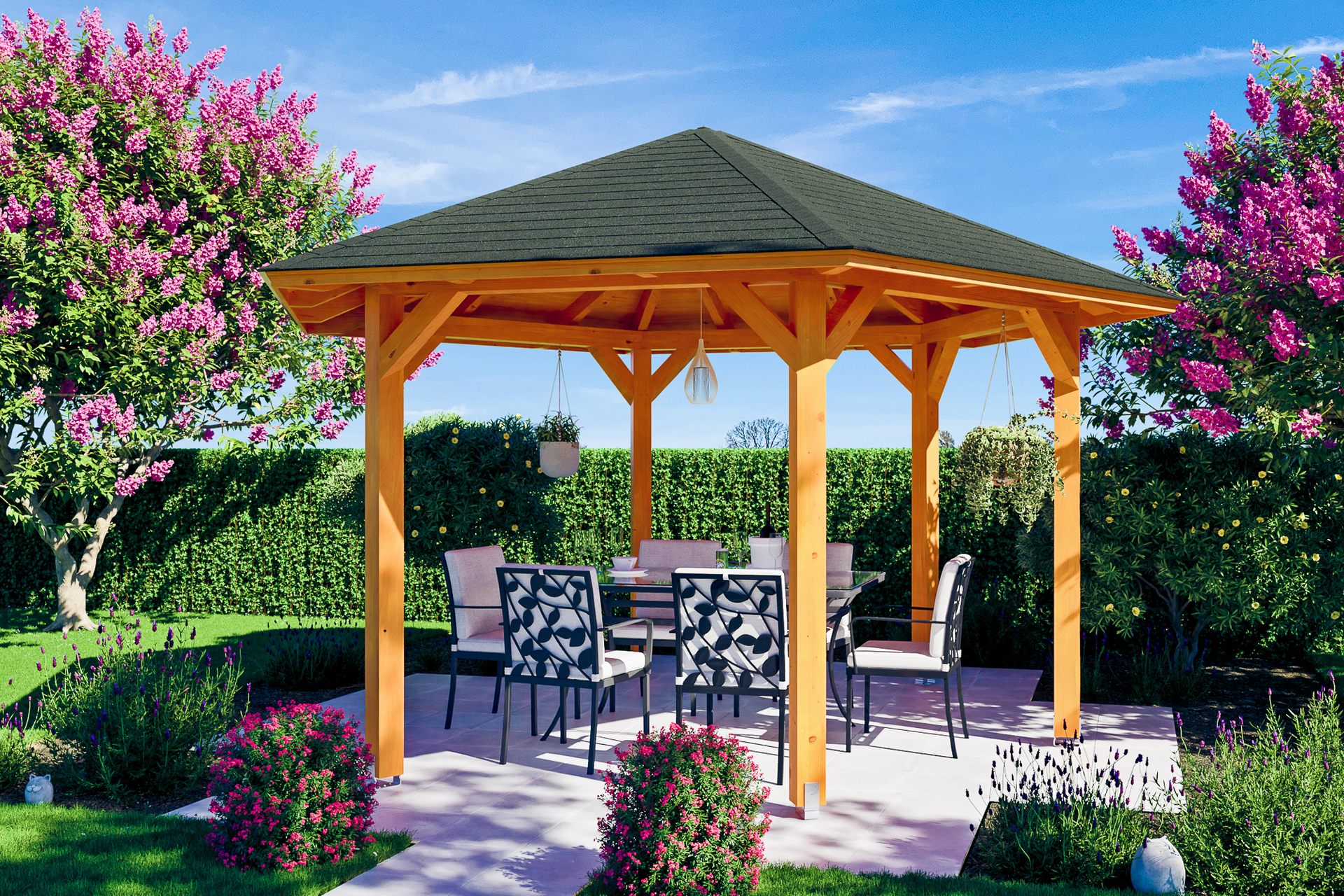 • 6-Eck Pavillon Ø 480 cm • massive Konstruktion aus hochwertigem Leimholz (BSH-Fichte) • farblich behandelt in eiche hell • Pfosten 12 x 12 cm inklusive Aufschraubstützen • gezapfte Pfosten-Pfetten-Verbindungen • gekervte Sparren • abgeschrägte Gratsparren • 20 mm Dachschalung • Dachschindeln als Zubehör erhältlich