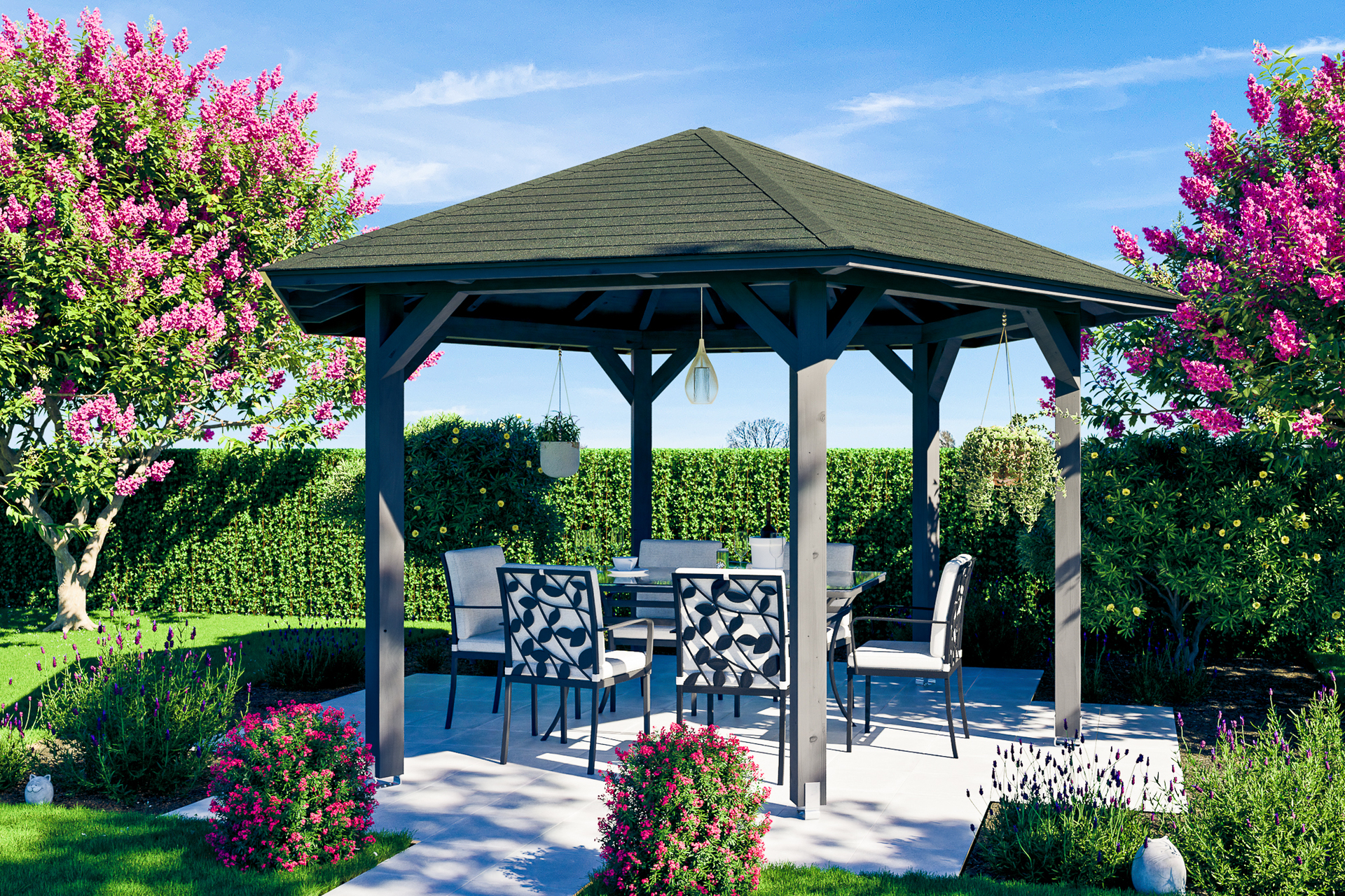 • 6-Eck Pavillon Ø 480 cm • massive Konstruktion aus hochwertigem Leimholz (BSH-Fichte) • farblich behandelt in schiefergrau • Pfosten 12 x 12 cm inklusive Aufschraubstützen • gezapfte Pfosten-Pfetten-Verbindungen • gekervte Sparren • abgeschrägte Gratsparren • 20 mm Dachschalung • Dachschindeln als Zubehör erhältlich