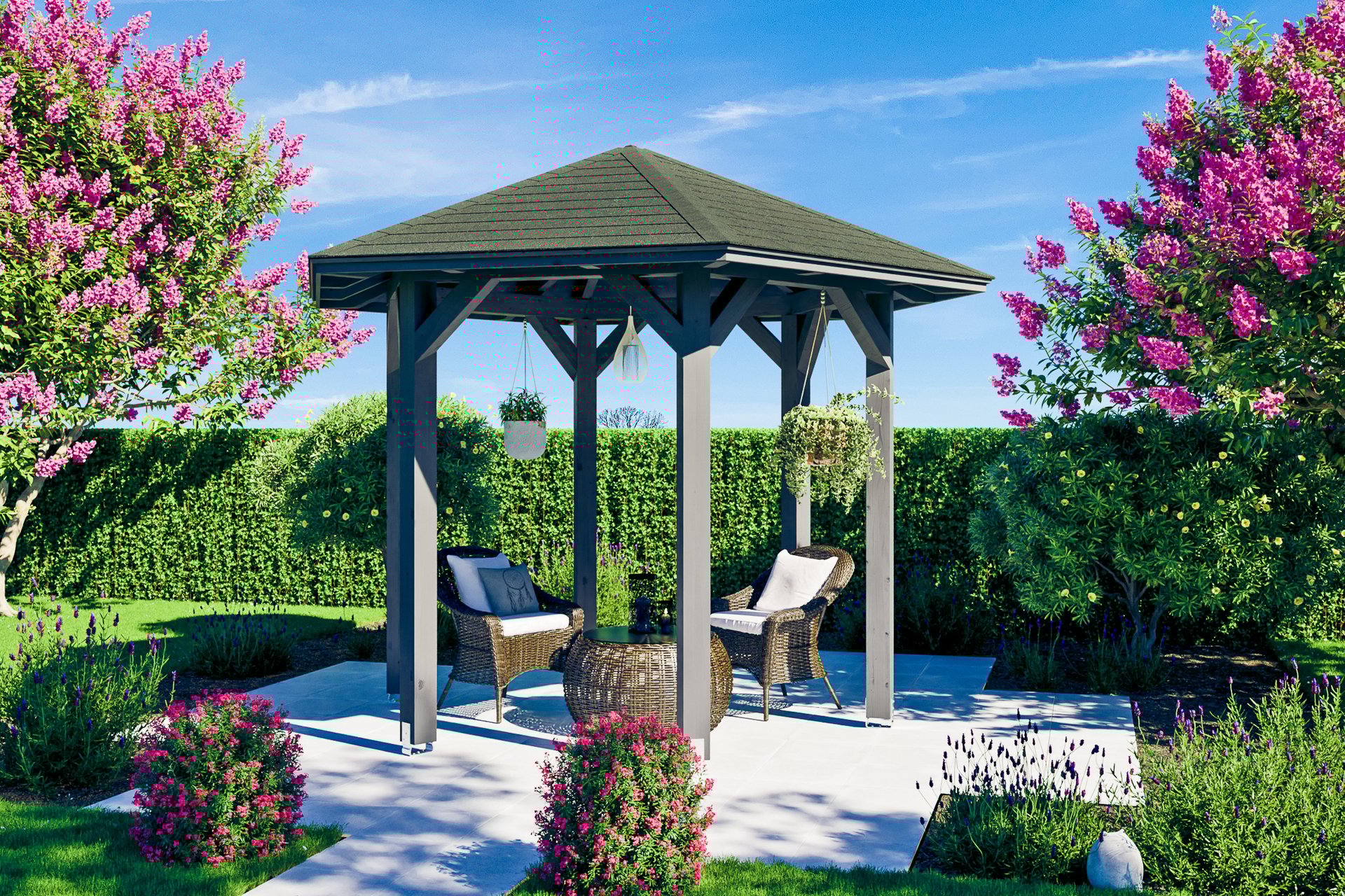 • 6-Eck Pavillon Ø 360 cm • massive Konstruktion aus hochwertigem Leimholz (BSH-Fichte) • farblich behandelt in schiefergrau • Pfosten 12 x 12 cm inklusive Aufschraubstützen • gezapfte Pfosten-Pfetten-Verbindungen • gekervte Sparren • abgeschrägte Gratsparren • 20 mm Dachschalung • Dachschindeln als Zubehör erhältlich