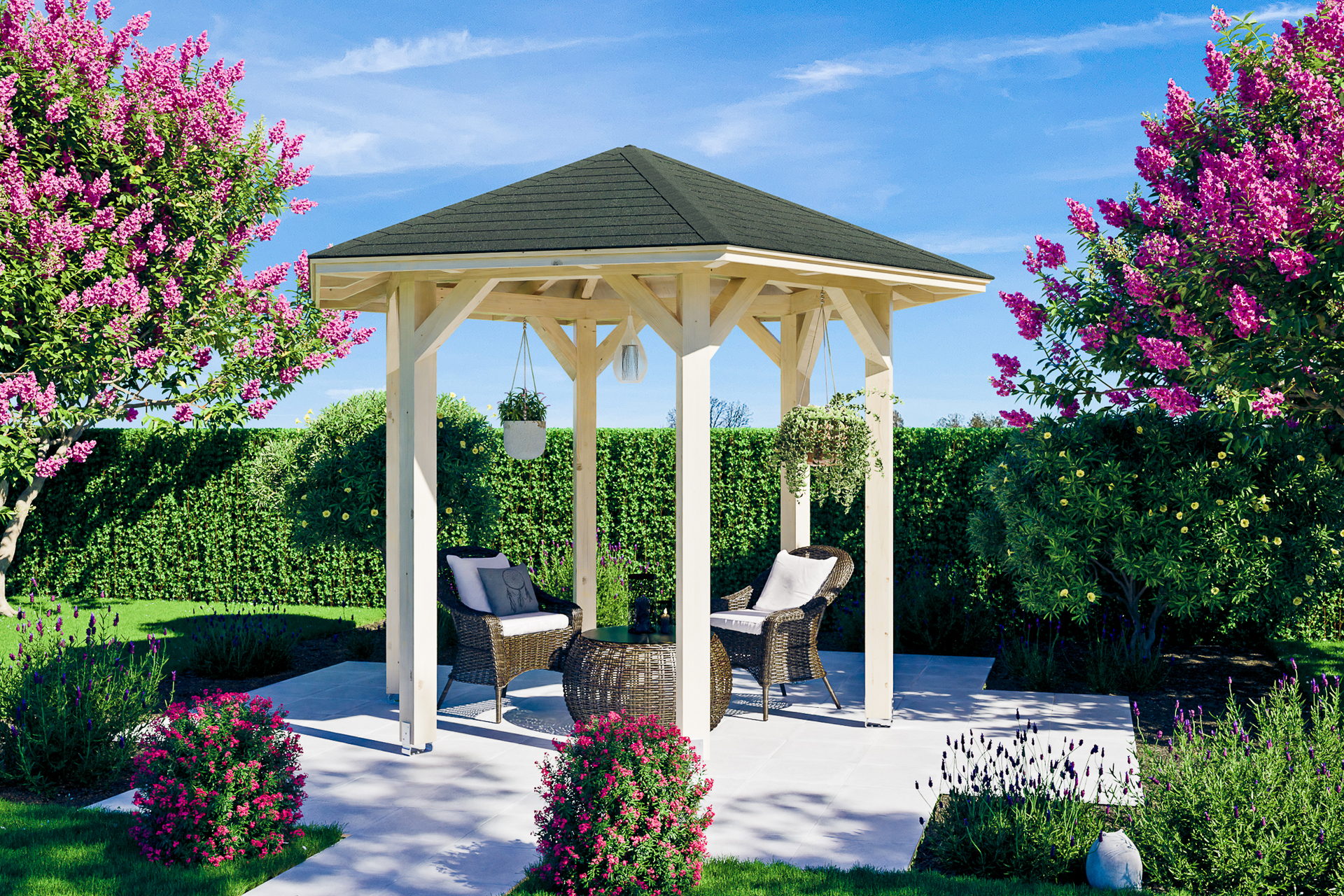 • 6-Eck Pavillon Ø 360 cm • massive Konstruktion aus hochwertigem Leimholz (BSH-Fichte) • farblich unbehandelt • Pfosten 12 x 12 cm inklusive Aufschraubstützen • gezapfte Pfosten-Pfetten-Verbindungen • gekervte Sparren • abgeschrägte Gratsparren • 20 mm Dachschalung • Dachschindeln als Zubehör erhältlich