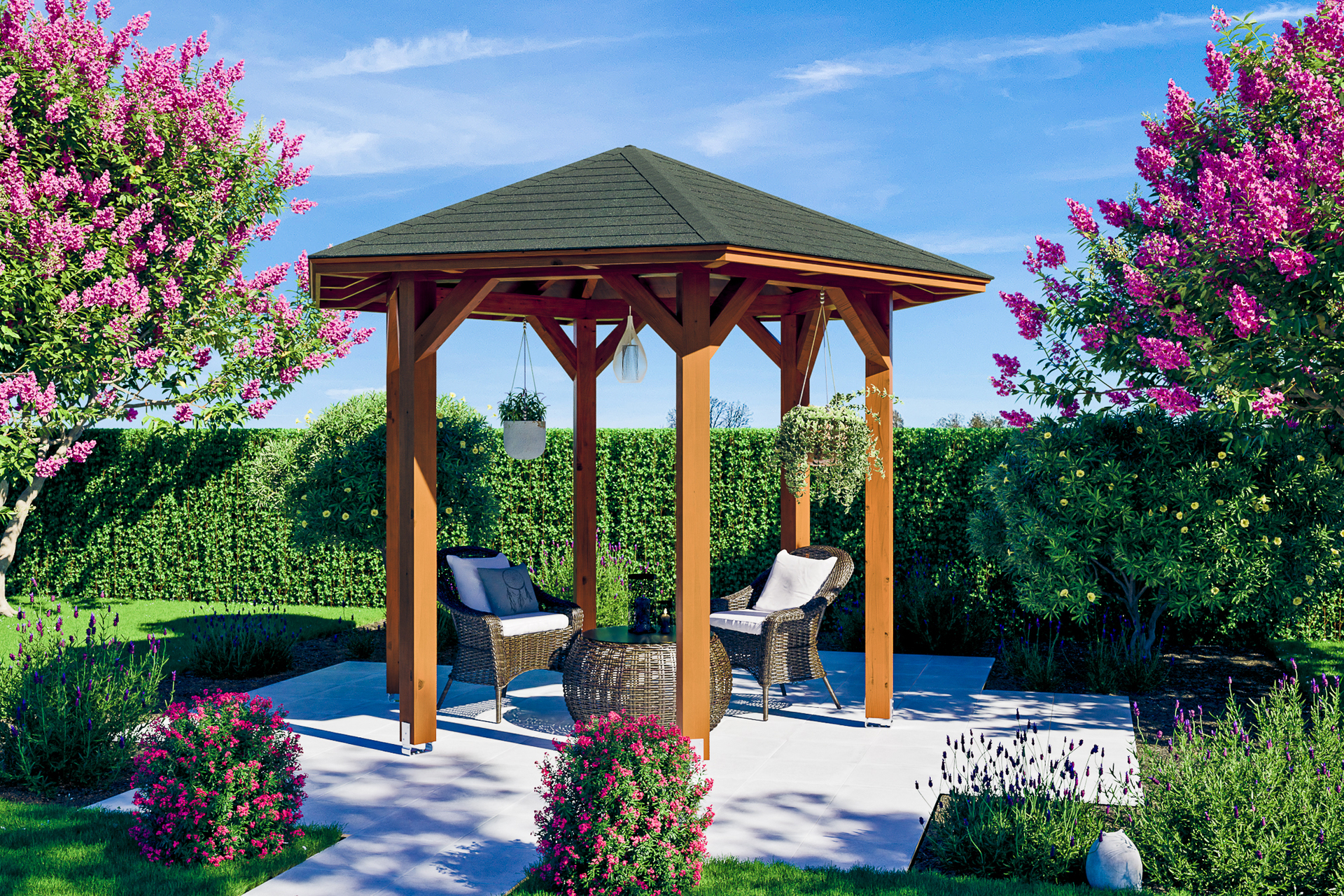• 6-Eck Pavillon Ø 360 cm • massive Konstruktion aus hochwertigem Leimholz (BSH-Fichte) • farblich behandelt in nussbaum • Pfosten 12 x 12 cm inklusive Aufschraubstützen • gezapfte Pfosten-Pfetten-Verbindungen • gekervte Sparren • abgeschrägte Gratsparren • 20 mm Dachschalung • Dachschindeln als Zubehör erhältlich