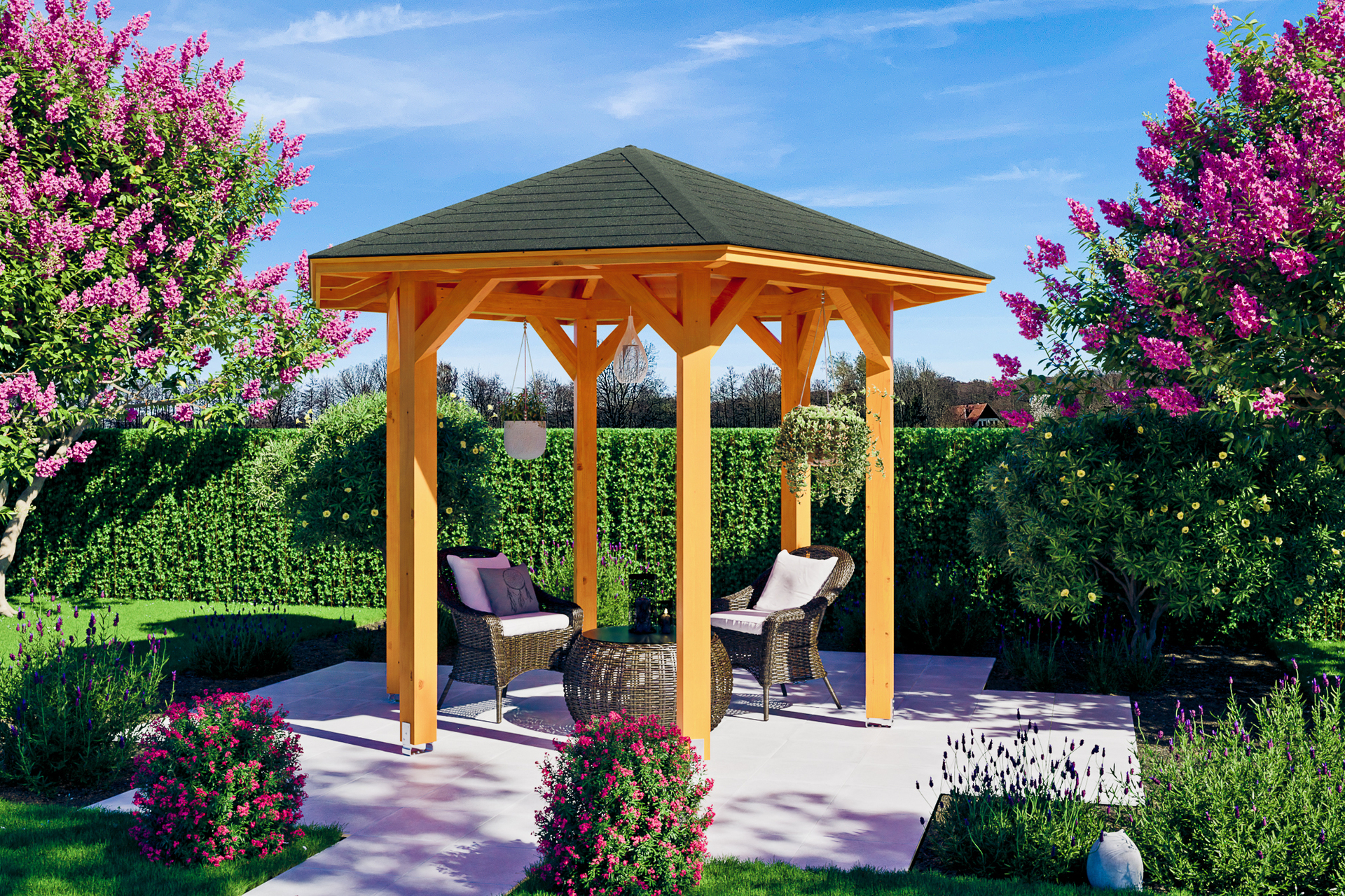 • 6-Eck Pavillon Ø 360 cm • massive Konstruktion aus hochwertigem Leimholz (BSH-Fichte) • farblich behandelt in eiche hell • Pfosten 12 x 12 cm inklusive Aufschraubstützen • gezapfte Pfosten-Pfetten-Verbindungen • gekervte Sparren • abgeschrägte Gratsparren • 20 mm Dachschalung • Dachschindeln als Zubehör erhältlich