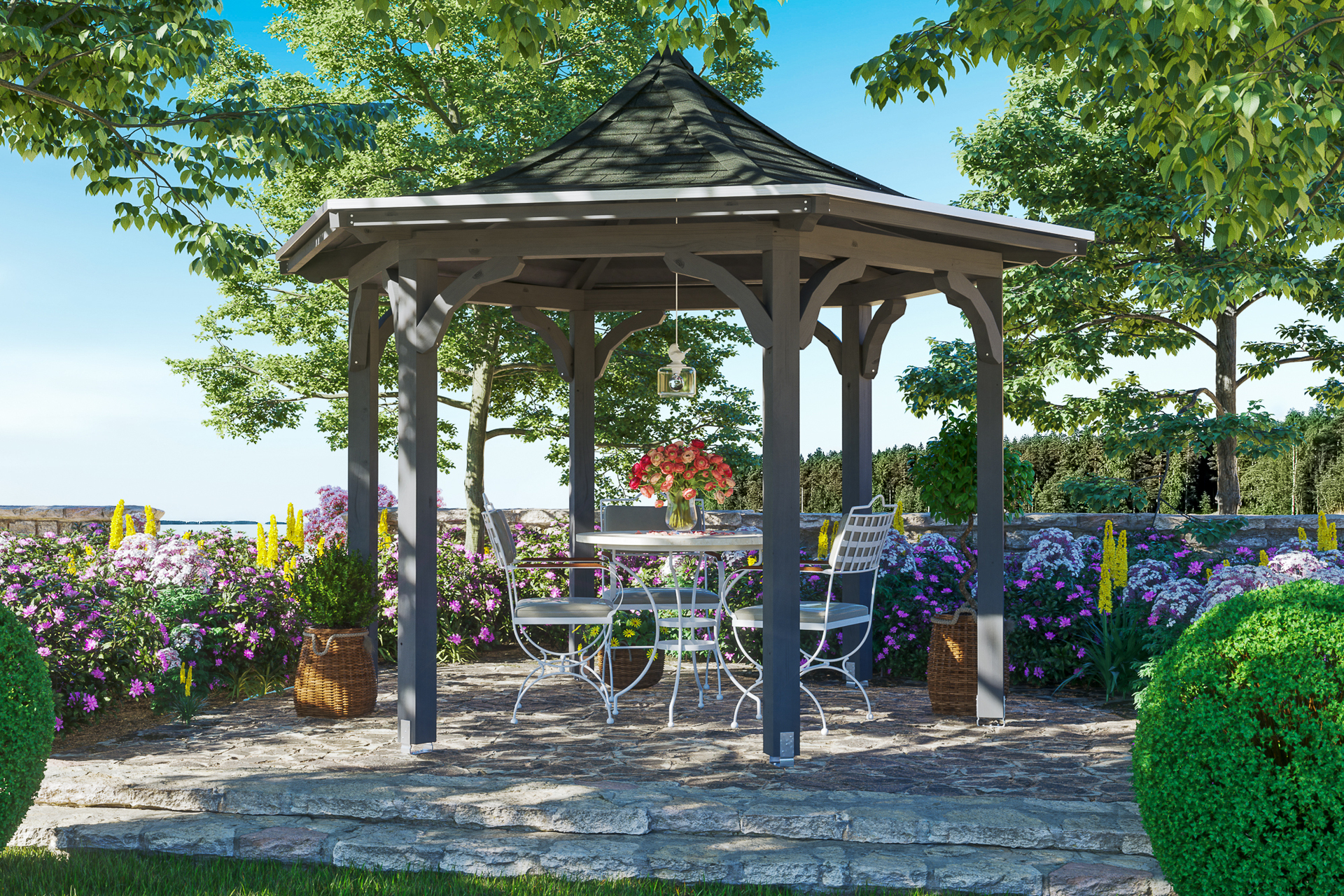• 6-Eck Pavillon Ø 418 cm • massive Konstruktion aus hochwertigem Leimholz (BSH-Fichte) • farblich behandelt in schiefergrau • Pfosten 12 x 12 cm inklusive Aufschraubstützen • geschwungene Dachkonstuktion • gezapfte Pfosten-Pfetten-Verbindungen • gekervte Sparren • 28 mm Dachschalung • Dachschindeln als Zubehör erhältlich