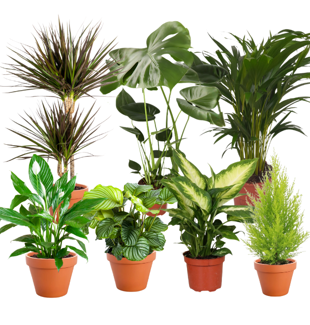 Mit unserem 7er-Pflanzen-Set für Zuhause holst du dir ein lebendiges Grün nach Hause, das sofort eine natürliche Atmosphäre schafft. Monstera, Einblatt, Dieffenbachie, Drachenbaum, Korbmarante, Goldfruchtpalme und Zimmerzypresse zeigen verschiedene Blattformen und Grüntöne, die zusammen ein harmonisches Bild ergeben. Die großen Blätter der Monstera, die schlanken Triebe des Drachenbaums und die gefiederten Wedel der Goldfruchtpalme erzeugen spannende Kontraste zwischen üppig und zart. So entsteht ein tropisches Flair, das jedem Raum sofort Frische und Leben verleiht. Dieses Indoor-Pflanzen-Set ist perfekt für Wohnzimmer, Büro oder jeden Lieblingsplatz, der mehr Grün vertragen kann.