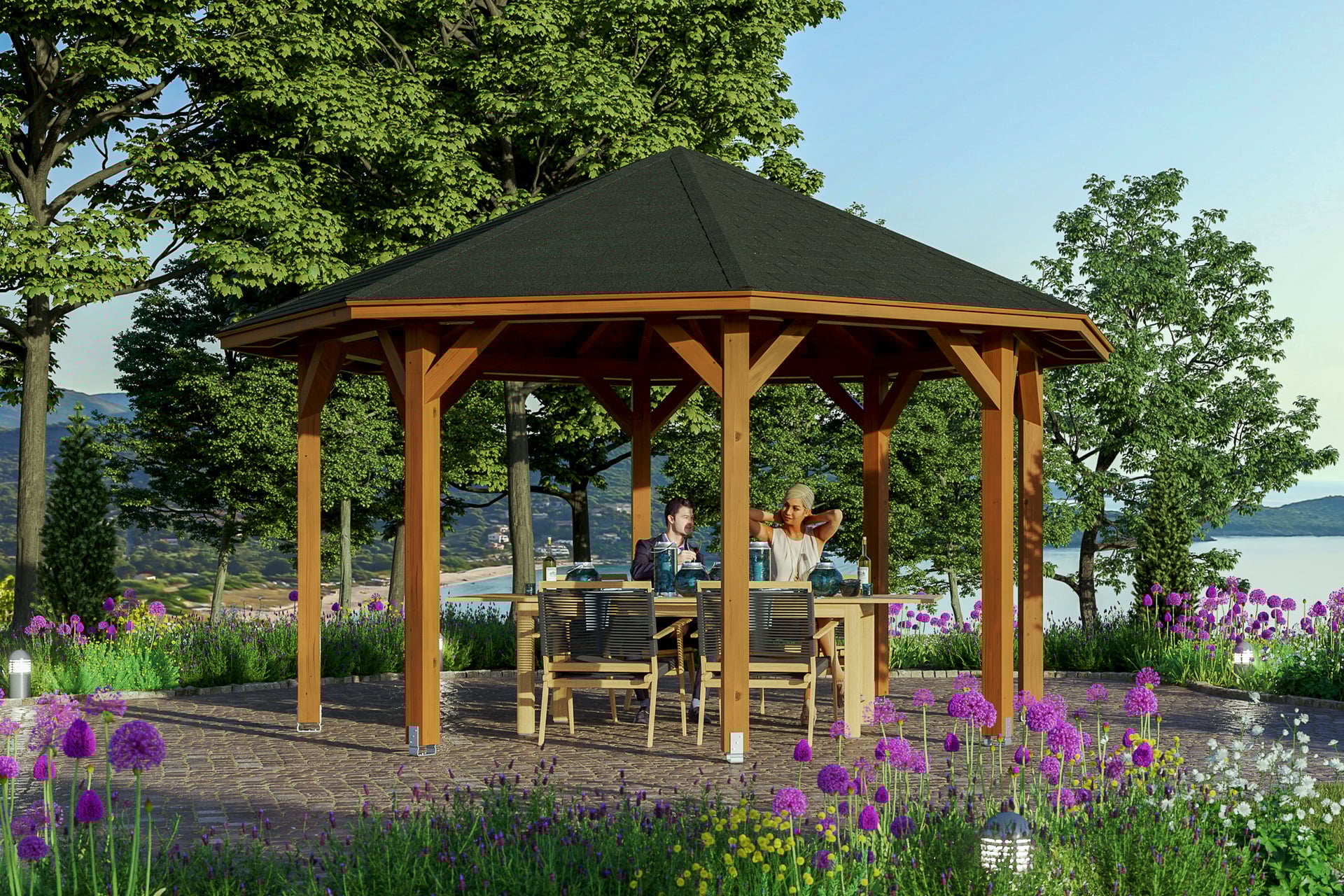 • 8-Eck Pavillon Ø 484 cm • massive Konstruktion aus hochwertigem Leimholz (BSH-Fichte) • farblich behandelt in nussbaum • Pfosten 12 x 12 cm inklusive Aufschraubstützen • gezapfte Pfosten-Pfetten-Verbindungen • gekervte Sparren • abgeschrägte Gratsparren • 20 mm Dachschalung • Dachschindeln als Zubehör erhältlich