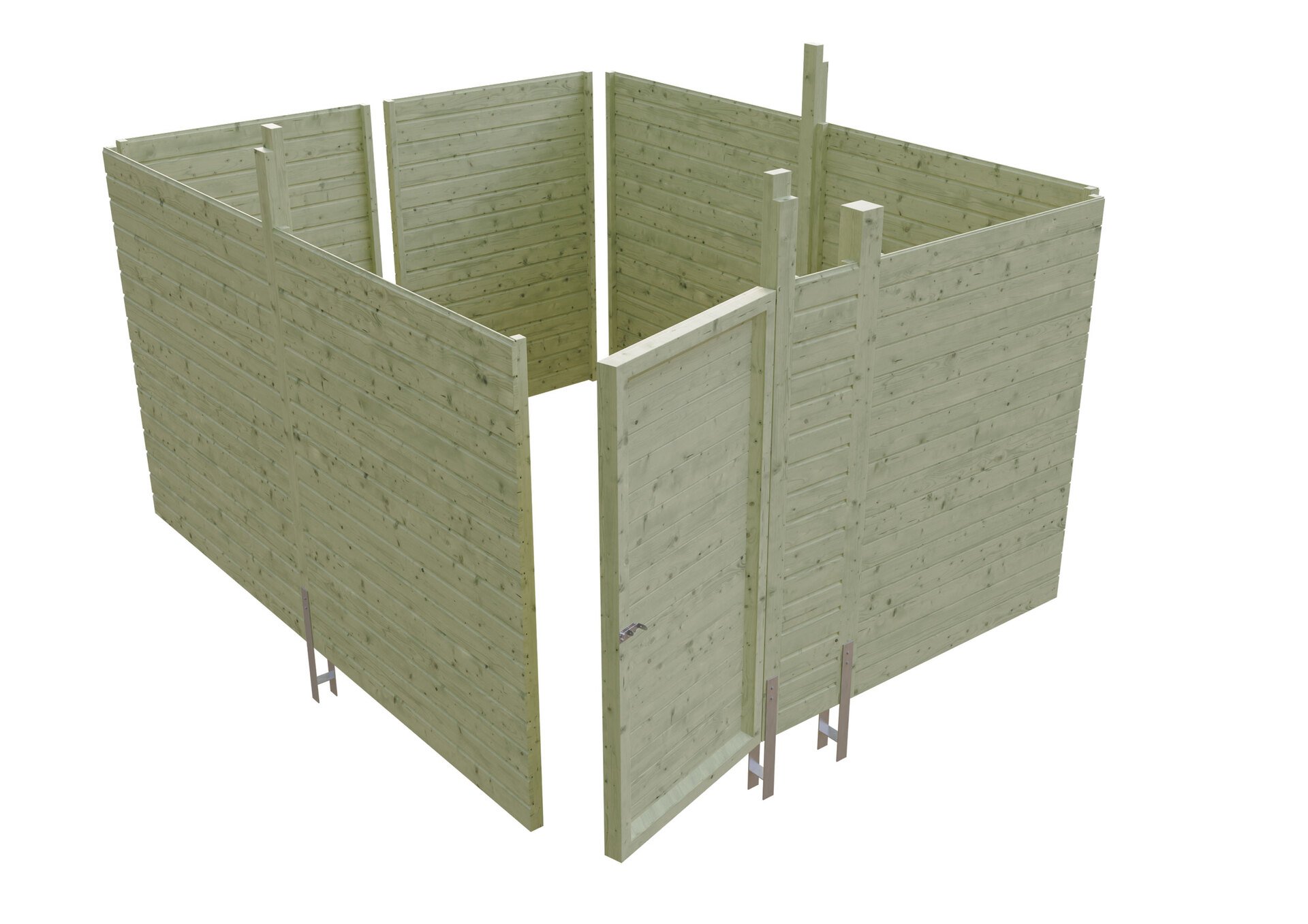 • Breite: 378 cm • Tiefe: 317 cm • Höhe: 200 cm • Tür (Durchgangsmaß 94 x 190 cm) • Stärke: 20 mm • Pfosten inklusive H-Pfostenanker • Rot markierte Pfosten sind carportseitig bereits vorhanden • bei Einbau unter einem Carport mit kleinerer Durchfahrtsbreite einfach bauseits anpassen • Material: Fichte • Grün imprägniert