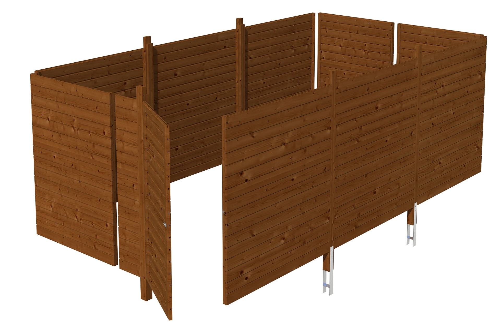 • Breite: 573 cm • Tiefe: 317 cm • Höhe: 200 cm • Tür (Durchgangsmaß 94 x 190 cm) • Stärke: 20 mm • Pfosten inklusive H-Pfostenanker • Rot markierte Pfosten sind carportseitig bereits vorhanden • bei Einbau unter einem Carport mit kleinerer Durchfahrtsbreite einfach bauseits anpassen • Material: Fichte • Farbbehandelt in Nussbaum