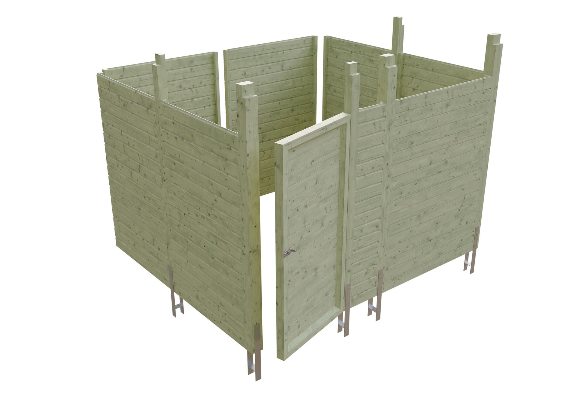 • Breite: 275 cm • Tiefe: 317 cm • Höhe: 200 cm • Tür (Durchgangsmaß 94 x 190 cm) • Stärke: 20 mm • Pfosten inklusive H-Pfostenanker • Rot markierte Pfosten sind carportseitig bereits vorhanden • bei Einbau unter einem Carport mit kleinerer Durchfahrtsbreite einfach bauseits anpassen • Material: Fichte • Grün imprägniert