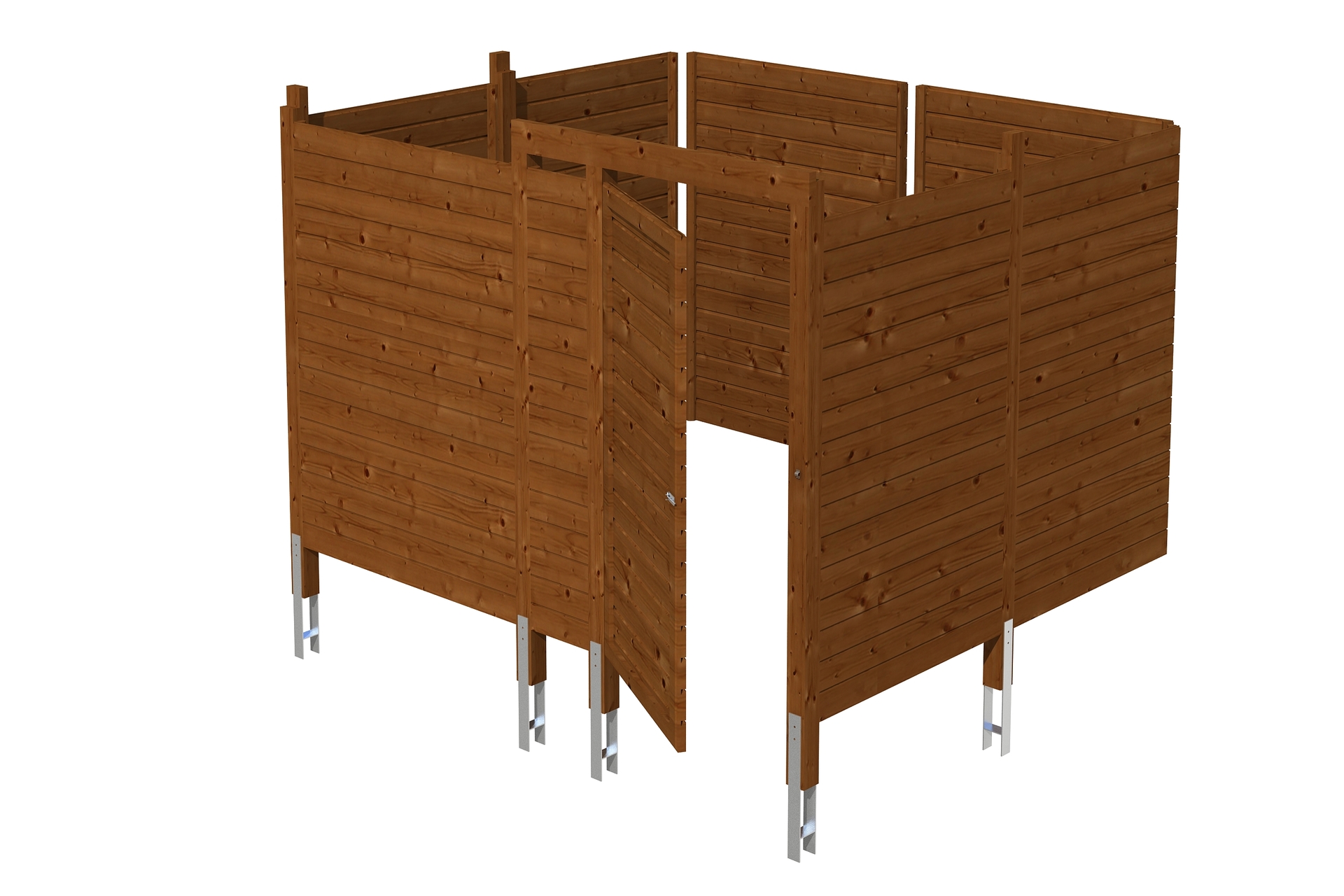• Breite: 275 cm • Tiefe: 317 cm • Höhe: 200 cm • Tür (Durchgangsmaß 94 x 190 cm) • Stärke: 20 mm • Pfosten inklusive H-Pfostenanker • Rot markierte Pfosten sind carportseitig bereits vorhanden • bei Einbau unter einem Carport mit kleinerer Durchfahrtsbreite einfach bauseits anpassen • Material: Fichte • Farbbehandelt in Nussbaum