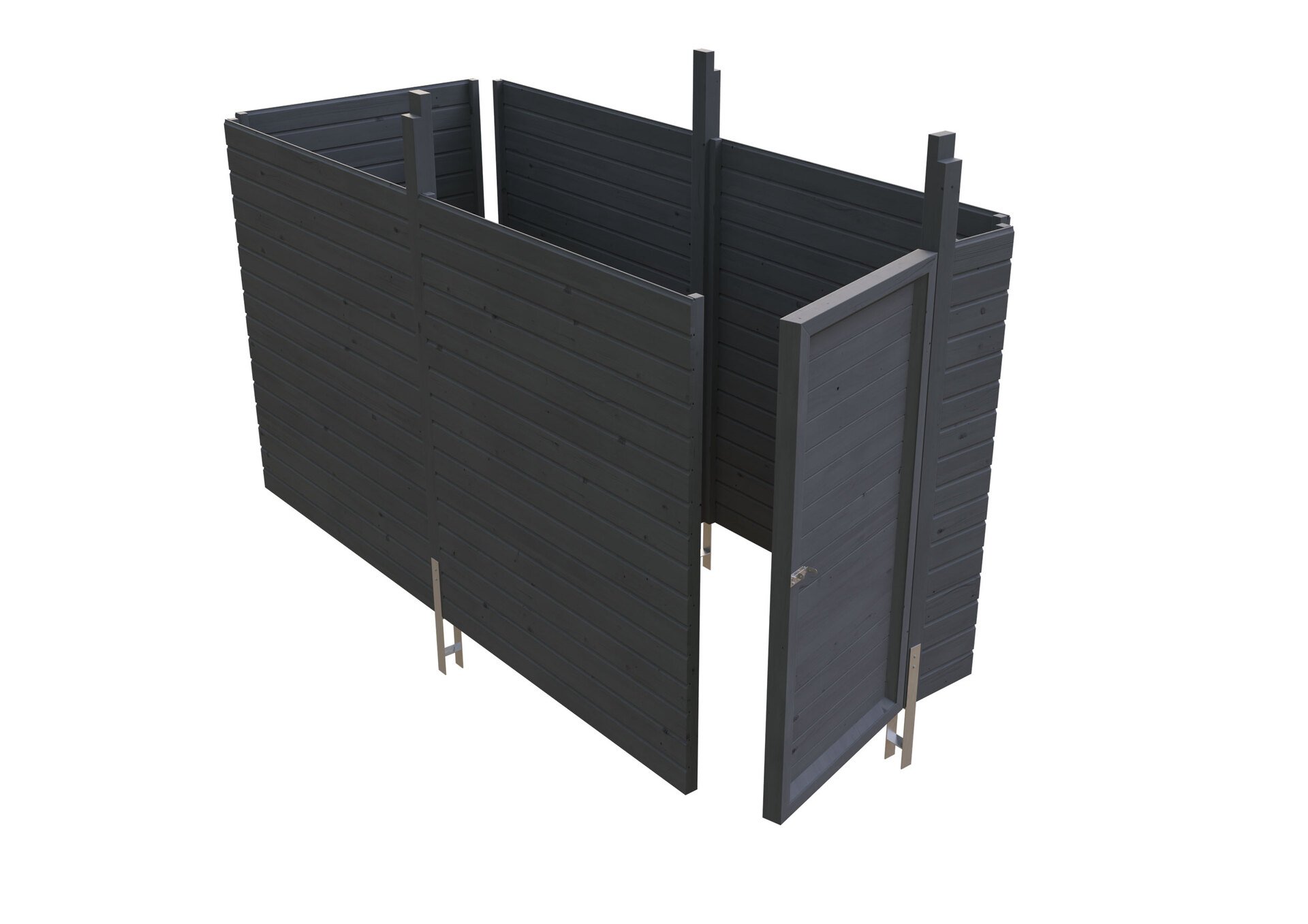• Breite: 314 cm • Tiefe: 164 cm • Höhe: 200 cm • Tür (Durchgangsmaß 94 x 190 cm) • Stärke: 20 mm • Pfosten inklusive H-Pfostenanker • Rot markierte Pfosten sind carportseitig bereits vorhanden • bei Einbau unter einem Carport mit kleinerer Durchfahrtsbreite einfach bauseits anpassen • Material: Fichte • Farbbehandelt in Schiefergrau