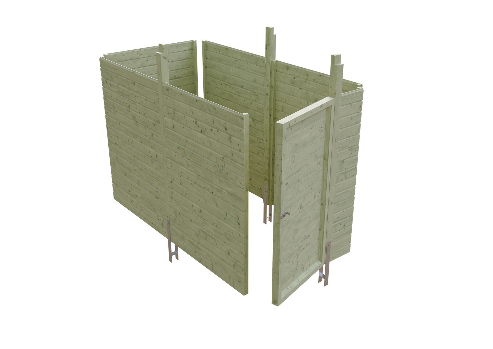 • Breite: 378 cm • Tiefe: 164 cm • Höhe: 200 cm • Tür (Durchgangsmaß 94 x 190 cm) • Stärke: 20 mm • Pfosten inklusive H-Pfostenanker • Rot markierte Pfosten sind carportseitig bereits vorhanden • bei Einbau unter einem Carport mit kleinerer Durchfahrtsbreite einfach bauseits anpassen • Material: Fichte • Grün imprägniert