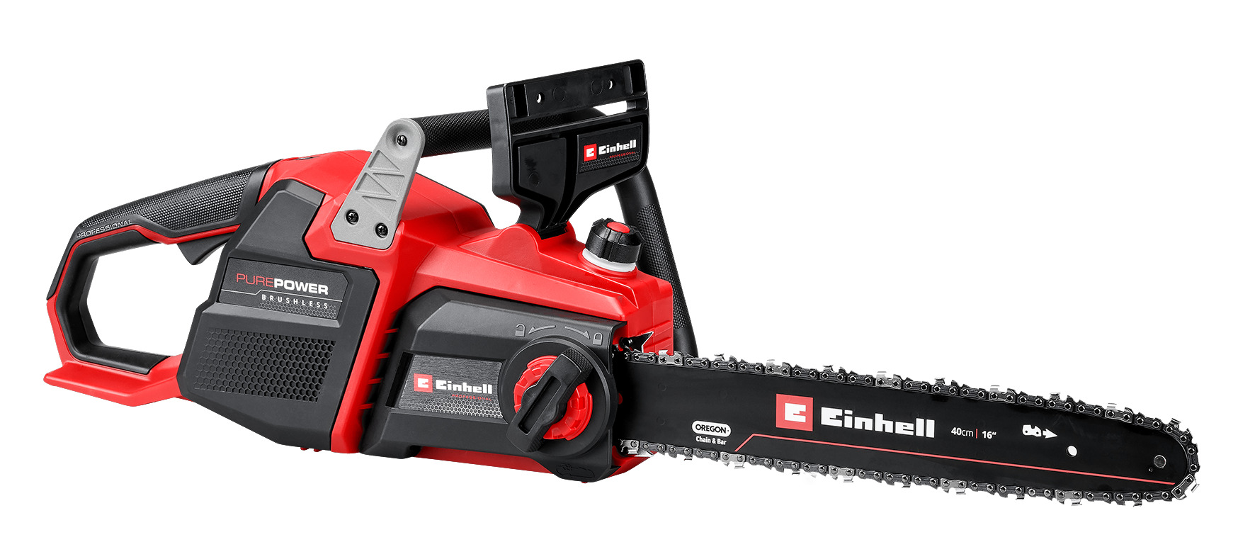 Akku-Kettensäge GP-LC 36/40 Li BL-Solo Die Einhell Professional Akku-Kettensäge GP-LC 36/40 Li BL-Solo ist ein zuverlässiges Arbeitsgerät zum Lichten und Fällen mittlerer und größerer Bäume, zur Bearbeitung von Brennholz und zum Kürzen und Zerlegen von Bauholz. Angetrieben wird das Gerät von einem Einhell Brushless Motor. Dieser bürstenlose Motor bietet mehr Kraft und eine längere Laufzeit als herkömmliche Kohlebürsten-Motoren. Nach einer Online-Registrierung gelten 10 Jahre Garantie auf den Brushless-Motor. Die Kettensäge mit 38 cm Schnittlänge ist mit einer hochwertigen OREGON Kette mit 1,3 mm Treibgliedstärke, 56 Treibgliedern und 3/8″ Kettenteilung ausgestattet. Für die optimale Sicherheit des Anwenders sorgt der Rückschlagschutz mit mechanischer Sofort-Kettenbremse. Ein Kettenfangbolzen fängt die Kette sofort ab, falls diese sich lösen sollte. Der robuste Krallenanschlag aus Metall sorgt für eine sichere und bequeme Führung bei allen Arbeiten, zusätzlich bietet der ergonomische Griff mit Softgrip einen festen und angenehmen Halt. Für Kettenwechsel und Kettenspannung wird kein Werkzeug benötigt. Die Sägekette wird dauerhaft und vollautomatisch mit Öl aus dem 230 ml großen Öltank versorgt. Über ein Schauglas am Tank lässt sich jederzeit der Füllstand ablesen. Direkt an der Professional Akku-Kettensäge ist eine 3-stufige LED-Anzeige angebracht, an welcher der aktuelle Ladezustand der eingesetzten Akkus abgelesen werden kann. Für ein noch besseres Handling werden die Akkus seitlich positioniert. Das bietet nicht nur Schutz für die Akkus, sondern balanciert die Kettensäge optimal aus. Die Lieferung der Einhell Professional Akku-Kettensäge GP-LC 36/40 Li BL-Solo erfolgt ohne Akku und ohne Ladegerät. – Breite: 23,5, – Gewicht: 4,8, – Höhe: 26,8, – Länge: 87,5 Akku-Kettensäge, Schwert, Kette, Schwertschutz