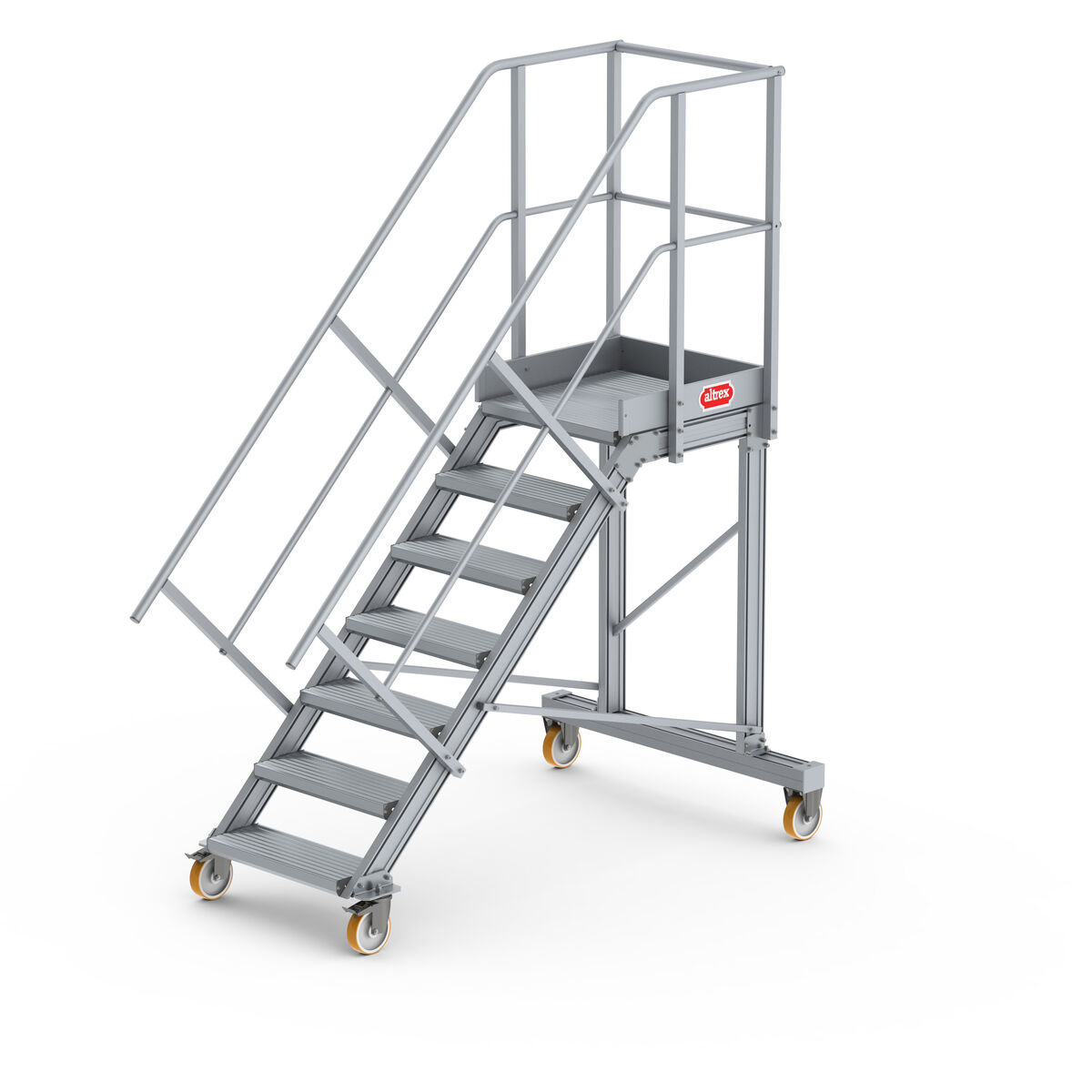 Podesttreppe• Große Plattform mit sicherem Plattformgeländer• Fahrbar dank Lenkrollen und mit praktischen Geländern• Spezifische Wünsche möglichPodesttreppe Modulare Treppe für das Lager oder die Wartung von MaschinenDie Altrex-Podesttreppe ist ein modulares System mit zahlreichen Anwendungsmöglichkeiten. Ideal für das Lager oder Wartungsarbeiten an Maschinen oder Produktionslinien. Die Podesttreppe ist dank 2 oder 4 Lenkrollen einfach und flexibel fahrbar. Wählen Sie den Neigungswinkel und die Breite der Stufen passend zu Ihrer Arbeit oder Ihren Wünschen.Einfach zu verstellenDank der Handgriffe und Lenkräder können Sie die Treppe einfach umstellen. Praktisch, wenn Sie an mehreren Stellen arbeiten. Die Podesttreppe ist mit 2 oder 4 Lenkrädern erhältlich.Ihr Wunsch, Ihre WahlDie Podesttreppe mit 2 Lenkrädern hat einen Neigungswinkel von 60 Grad. D…