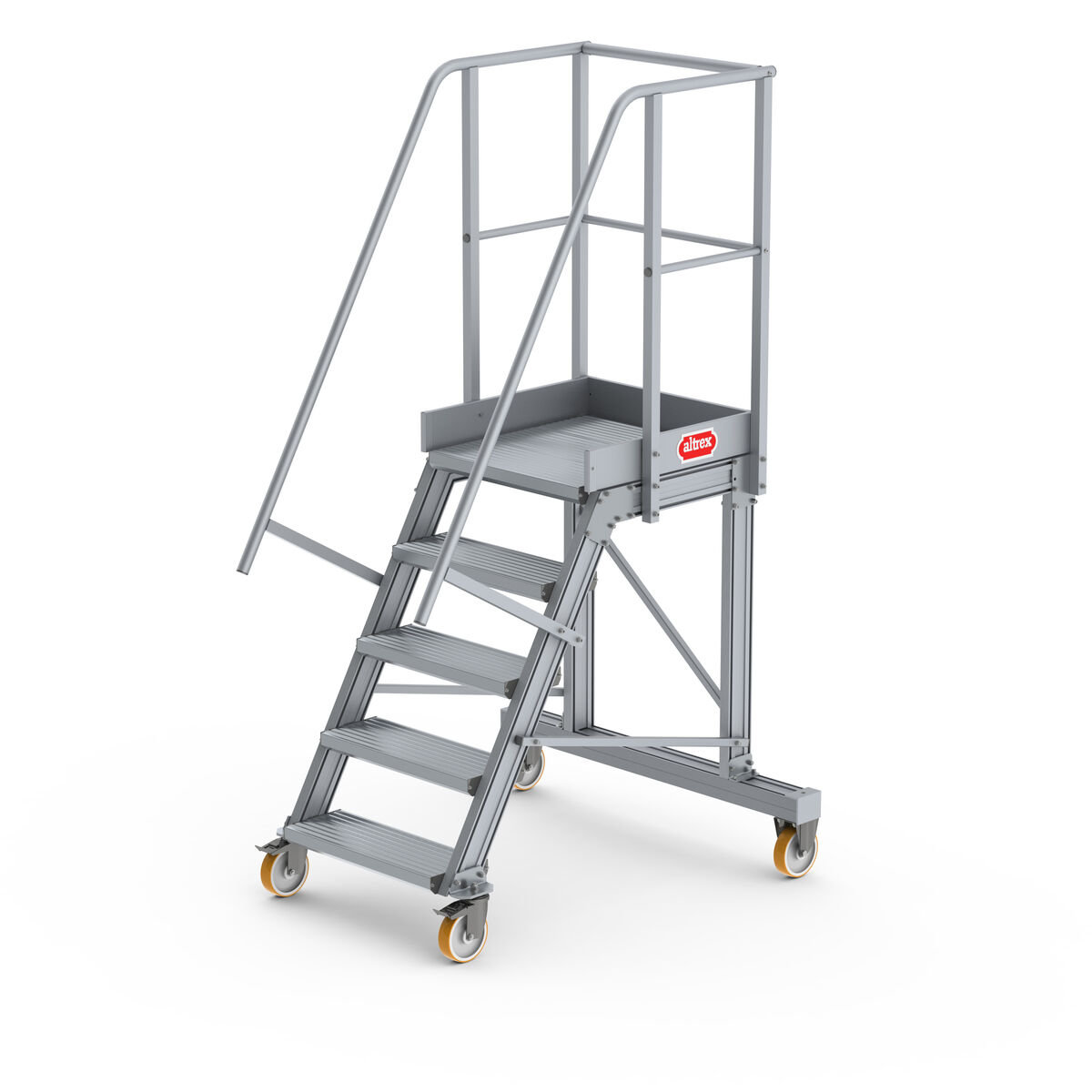 Altrex Podesttreppe mit Standhöhe 1,22m• Große Plattform mit sicherem Plattformgeländer• Fahrbar dank Lenkrollen und mit praktischen Geländern• Spezifische Wünsche möglichPodesttreppe Modulare Treppe für das Lager oder die Wartung von MaschinenDie Altrex-Podesttreppe ist ein modulares System mit zahlreichen Anwendungsmöglichkeiten. Ideal für das Lager oder Wartungsarbeiten an Maschinen oder Produktionslinien. Die Podesttreppe ist dank 2 oder 4 Lenkrollen einfach und flexibel fahrbar. Wählen Sie den Neigungswinkel und die Breite der Stufen passend zu Ihrer Arbeit oder Ihren Wünschen.Einfach zu verstellenDank der Handgriffe und Lenkräder können Sie die Treppe einfach umstellen. Praktisch, wenn Sie an mehreren Stellen arbeiten. Die Podesttreppe ist mit 2 oder 4 Lenkrädern erhältlich.Ihr Wunsch, Ihre WahlDie Podesttreppe mit 2 Lenkrädern hat einen Ne…