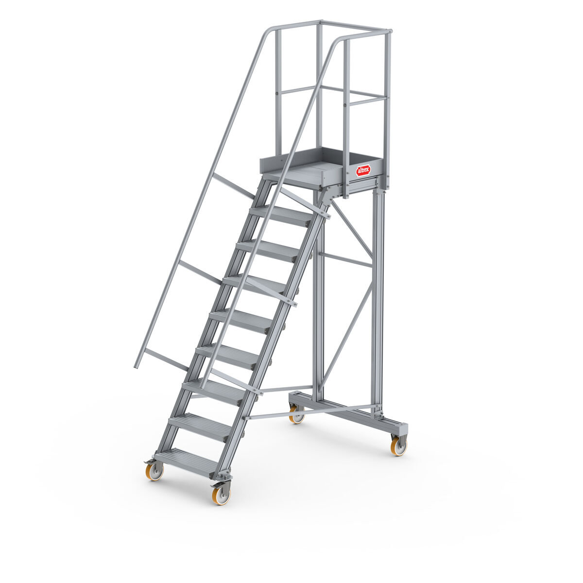 Altrex Podesttreppe mit Standhöhe 2,2m• Große Plattform mit sicherem Plattformgeländer• Fahrbar dank Lenkrollen und mit praktischen Geländern• Spezifische Wünsche möglichPodesttreppe Modulare Treppe für das Lager oder die Wartung von MaschinenDie Altrex-Podesttreppe ist ein modulares System mit zahlreichen Anwendungsmöglichkeiten. Ideal für das Lager oder Wartungsarbeiten an Maschinen oder Produktionslinien. Die Podesttreppe ist dank 2 oder 4 Lenkrollen einfach und flexibel fahrbar. Wählen Sie den Neigungswinkel und die Breite der Stufen passend zu Ihrer Arbeit oder Ihren Wünschen.Einfach zu verstellenDank der Handgriffe und Lenkräder können Sie die Treppe einfach umstellen. Praktisch, wenn Sie an mehreren Stellen arbeiten. Die Podesttreppe ist mit 2 oder 4 Lenkrädern erhältlich.Ihr Wunsch, Ihre WahlDie Podesttreppe mit 2 Lenkrädern hat einen Nei…
