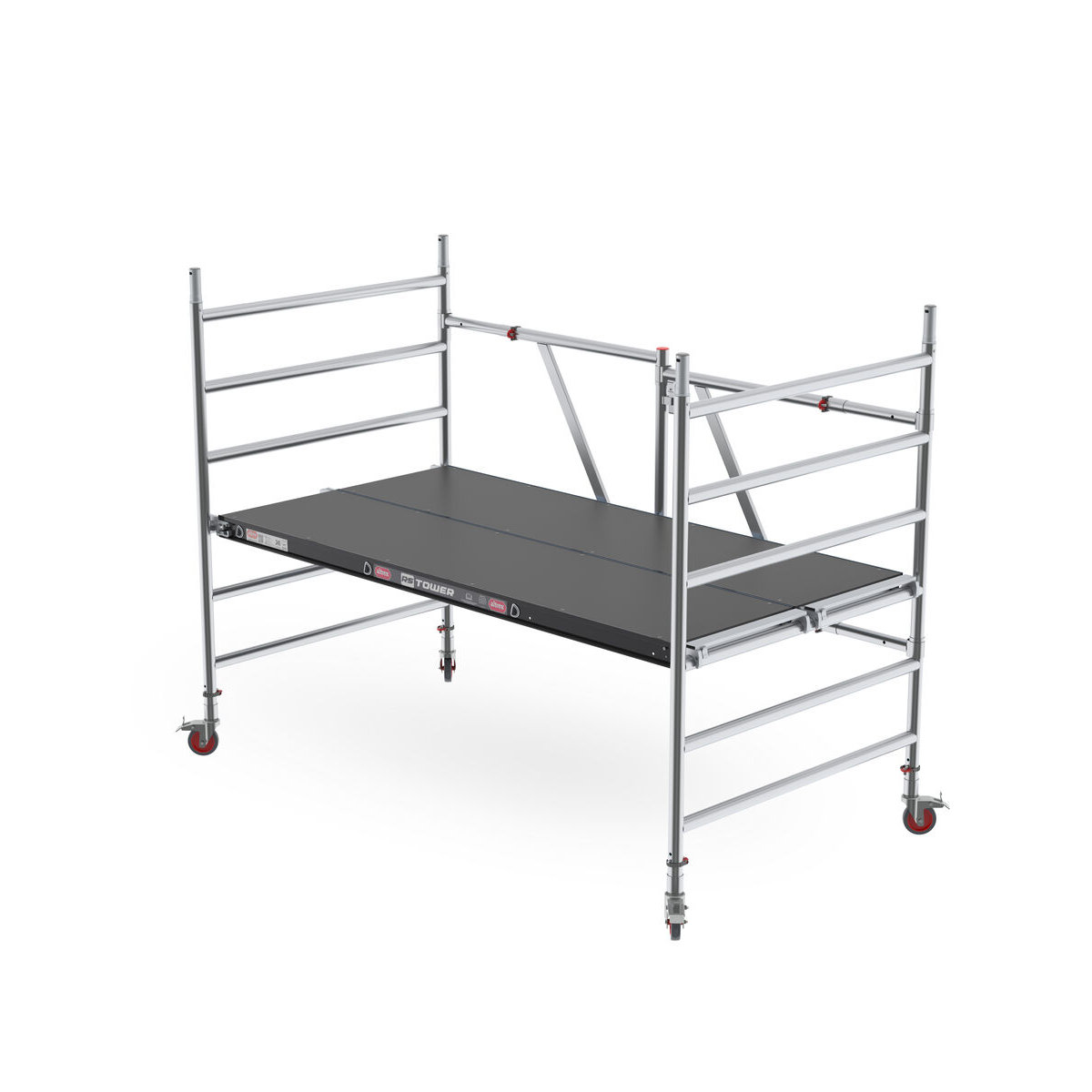 RS TOWER 55 klapp-/ fahrgerüst breit•    Breites Gerüst, große Arbeitsfläche•    Ausbaufähig bis 13,8 m, auch in Safe-Quick® Ausführung•    Klappbar, Teleskoprahmen•    Mit allen Komponenten der RS TOWER 5-Serie kombinierbar•    Leichtgewicht Fiber-Deck®-Plattformen oder HolzplattformenRS TOWER 55 Fahrgerüst klappbar. Fahrgerüst mit großer ArbeitsflächeDas RS TOWER 55 ist ein breites Fahrgerüst. Für den Innen- und Außenbereich geeignet. Ideal für die Arbeit mit zwei Personen. Die Basis dieses Gerüst besteht aus einem praktischen Zimmergerüst, das bis auf eine Arbeitshöhe von bis zu 13,80 m ausgebaut werden kann.Die Rahmen sind 1,35 m breit. Durch die teleskopischen Teil können Sie Plattformen von 1,85 m, 2,45 m oder 3,05 m nutzen. Rundum geschweißte rutschsicheren Sprossen und fest integrierte Sicherungsstifte machen den Rahmen außerdem sehr robust und 100%ig zuverlässig. Die Rahmen a…