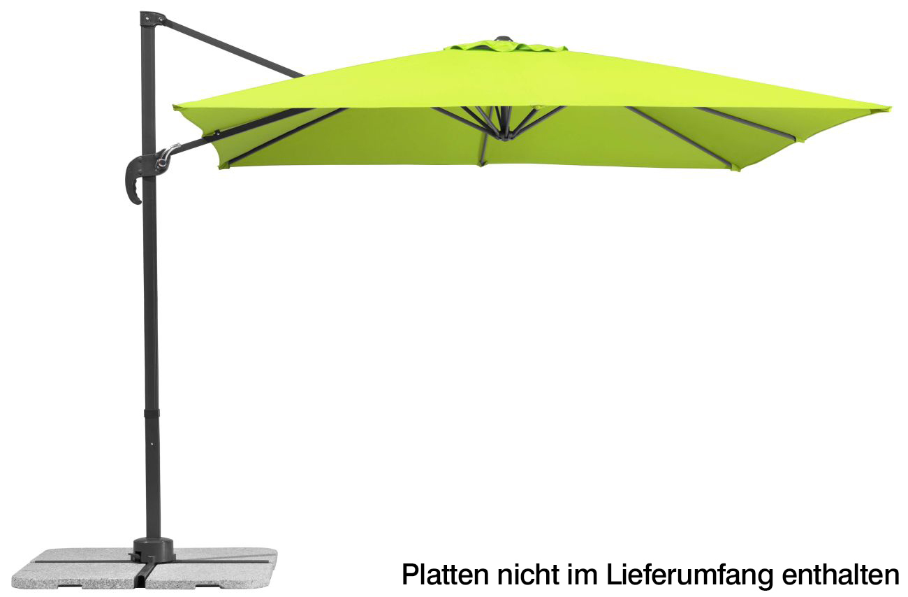Dieser Sonnenschirm ist ein quadratischer Ampelschirm in der Größe 270 x 270 cm.