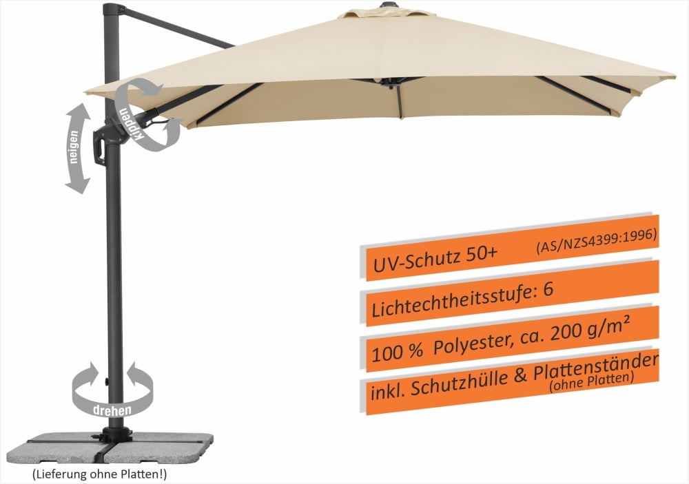 Ampelschirm Rhodos Twist Mit dem Ampelschirm Rhodos Twist holen Sie sich ein qualitativ und auch technisch hochwertiges Produkt in Ihren Garten. Rhodos Twist – der Alleskönner Dieser Sonnenschirm ist ein quadratischer Ampelschirm in der Größe 300 x 300 cm. Die Bespannung ohne Volant und mit air-vent besteht aus 100 % Polyester. Sie ist mit einer Stärke von 200 g/m² sehr widerstandsfähig und verrottungsfest. Zudem verfügt Sie über eine wasserabstoßende Imprägnierung, wodurch Sie auch bei einem leichten Schauer keine Sorge haben müssen nass zu werden. Gemäß dem australisch/neuseeländischem Standard liegt der UV-Schutz für diesen Schirm bei 50+, womit Sie exzellent vor der direkten Sonneneinstrahlung geschützt sind. Technik Das Alu/Stahl-Gestell ist anthrazitgrau pulverbeschichtet und passt somit optisch sehr gut zur Bespannung. Der einteilige Stock hat eine Stärke von 53 x 80 mm und verfügt über ein massives Drehgelenk mit Fußpedal. Die Streben haben eine Stärke von 26 x 18 mm. Der Handgriff mit integrierter Kurbel ermöglicht sowohl ein komfortables und leichtes Öffnen und Schließen des Schirmes, als auch eine Einstellung der Dachneigung bis zu 50° entlang des Mastes. Zusätzlich bietet er noch die Funktion des beidseitigen Kippens um 45° entlang des Auslegearms. Durch betätigen des Fußpedals am Drehgelenk lässt sich der Schirm zudem um 360° drehen, wodurch es Ihnen möglich ist, den Sonnenschutz ohne viel Aufwand entsprechend der Sonneneinstrahlung auszurichten. Lieferumfang Im Lieferumfang enthalten ist ein Plattenständer für 4 Wegeplatten in der Größe 50 x 50 x 5 cm (Platten nicht enthalten), welcher dem Schirm einen sehr stabilen Halt gibt. Optional können Sie zu dem Schirm auch die extra für Ampelschirme hergestellten Einlegeplatten für Ständerkreuze (Art. 312-15), eine Bodenplatte zum Einbetonieren (Art. 897-00), einen Bodenanker zum Eingraben (Art. 897-50), einen Bodendübel zum Eindrehen (Art. 897-55) oder unseren fahrbaren Ampelschirmständer (Art. 319-15) nutzen. Zu dem fahrbaren Ampelschirmständer kann eine Lenkstange (Art. 319-50) dazu erworben werden, welche das mühelose Bewegen des Schirmständers ermöglicht. Durch unsere Ampelschirm-Windsicherung (Art. 313-00) wird die Schwankbewegung durch Wind und somit die Belastung auf das Schirmgestell reduziert. Der Ampelschirm wird inklusive lichtundurchlässiger Schutzhülle mit Reißverschluss und Stab geliefert, somit ist Ihr Schirm vor äußeren Einflüssen geschützt und Sie haben länger Freude daran. Durch den Stab ist das Überziehen der Schutzhülle sogar bei aufgestelltem Schirm ein Kinderspiel.