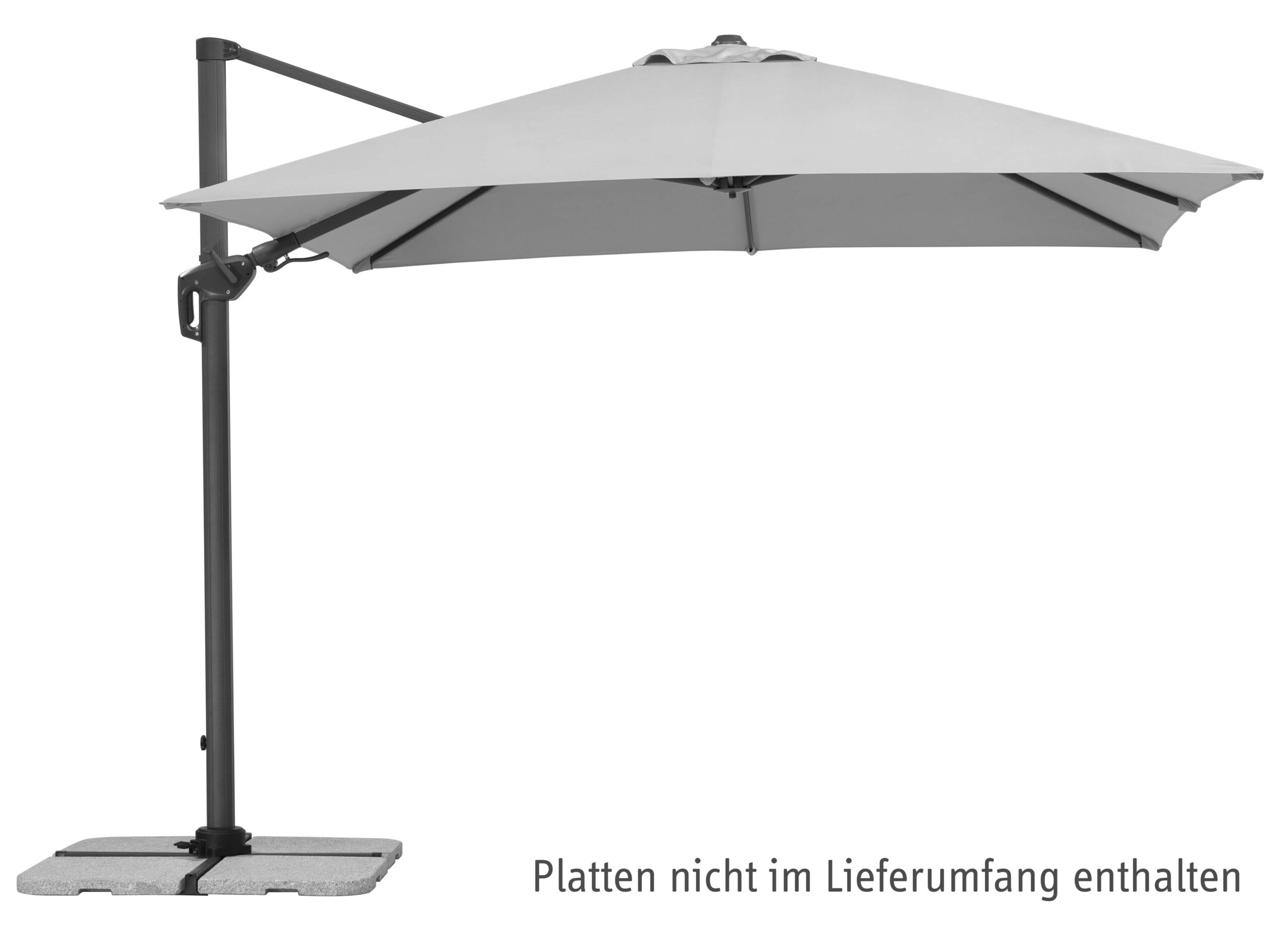 Dieser Sonnenschirm ist ein quadratischer Ampelschirm in der Größe 300 x 300 cm.