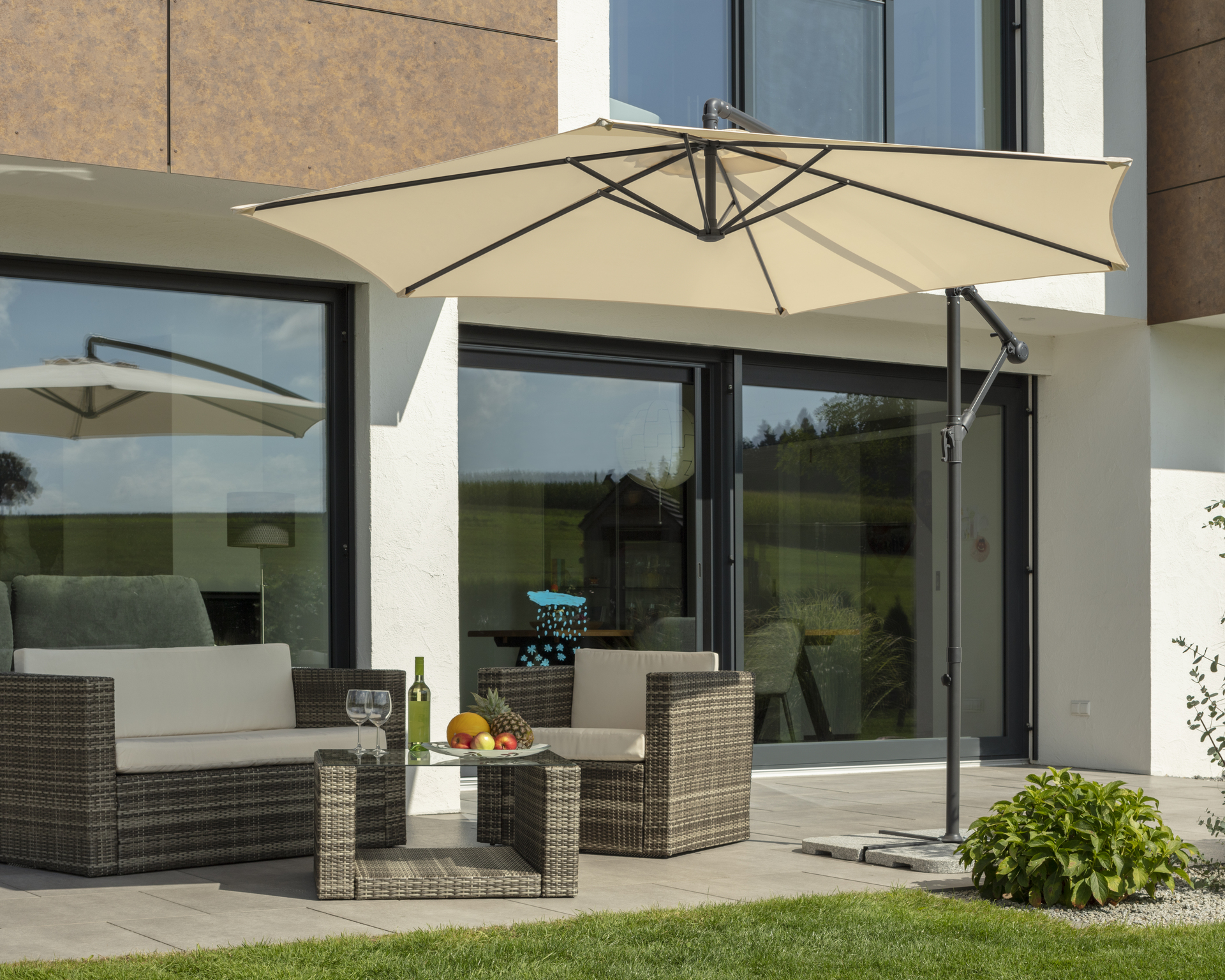 Per Kurbelöffnung lässt sich dieser Schirm einfach öffnen und schließen. Die Dachneigung kann je nach Sonnenstand bequem stufenlos eingestellt werden.