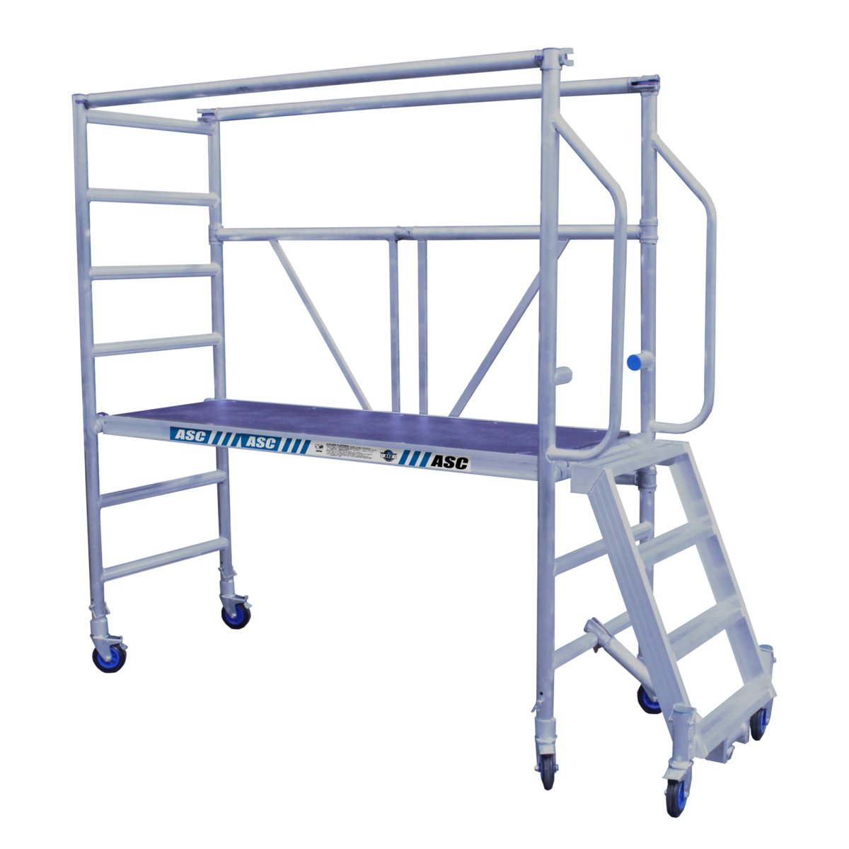 ASC Innenraum-Rollgerüst mit Zugangstreppe – kompakt, sicher und besonders komfortabelDas ASC Zimmergerüst mit integrierter Zugangstreppe bietet maximale Sicherheit und hohen Bedienkomfort bei Arbeiten in geringer Höhe. Die breiten Anti-Rutsch-Stufen und der stabile Handlauf ermöglichen ein müheloses und sicheres Betreten der Plattform.Die Arbeitshöhe lässt sich flexibel von 0,5 bis 1,0 m einstellen – ideal für Malerarbeiten, Renovierungen, Installationen und andere Innenraumprojekte.Mit einer Breite von 0,75 m und einer Länge von 1,90 m bietet das Gerüst eine großzügige Arbeitsfläche, ohne in engen Räumen zu stören. Durch Türen und Flure lässt es sich problemlos bewegen.Für zusätzliche Sicherheit sorgen zwei horizontale Geländerstreben, die serienmäßig im Lieferumfang enthalten sind. Die leichte, stabile Konstruktion ist schnell auf- und abzubauen – perfekt für Profis und Heimw…