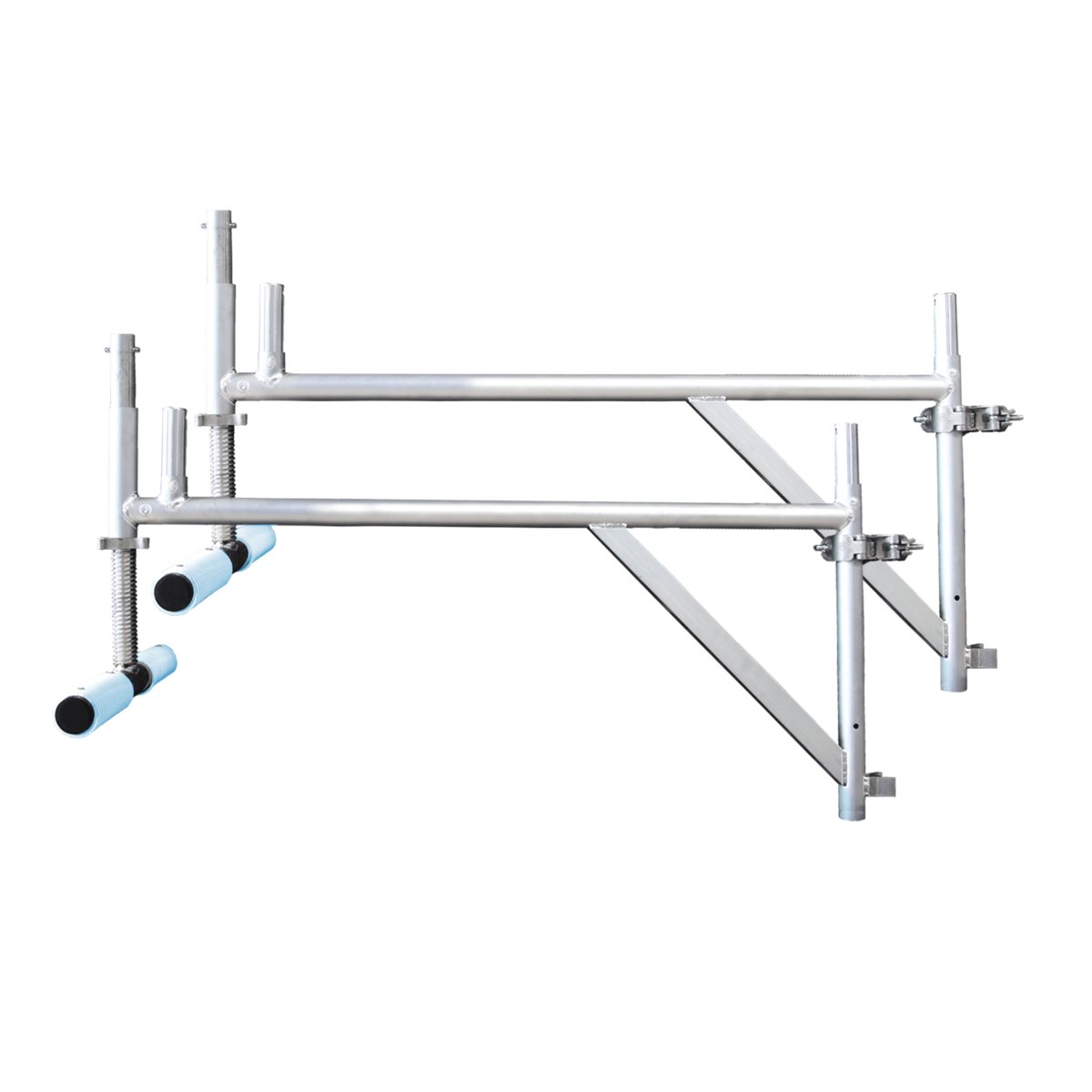 Die Dachkonsole ist ein sehr nützliches Werkzeug, um Gauben und Schrägdächer von einem Fahrgerüst aus zugänglich zu machen. Die Erweiterungskonsole lässt sich schnell montieren und die Verlängerungskonsole kann schnell und einfach (in Kombination mit Ihrem Standardgerüstmaterial) in jeder Höhe montiert werden.Ein Satz besteht aus zwei Stützen und einem Verlängerungsstück. Sie befestigen die Konsole mit Stahldrehkupplungen an der Außenseite des Fahrgerüsts. Die Konsole liegt mit ihrer Unterseite am Pfosten des Aufsteckrahmens an; das T-Stück – mit einer Kunststoffschutzhülle versehen, um Beschädigungen der Dachziegel zu vermeiden – liegt auf dem Dach auf. Als Handlauf können Sie die Standard-Konstruktionsrahmen oder einzelne Rohre mit Kupplungen verwenden.Die Dachkonsole ist nicht für frei hängende Anwendungen geeignet. Diese Dachkonsole entspricht der Norm EN 1004.