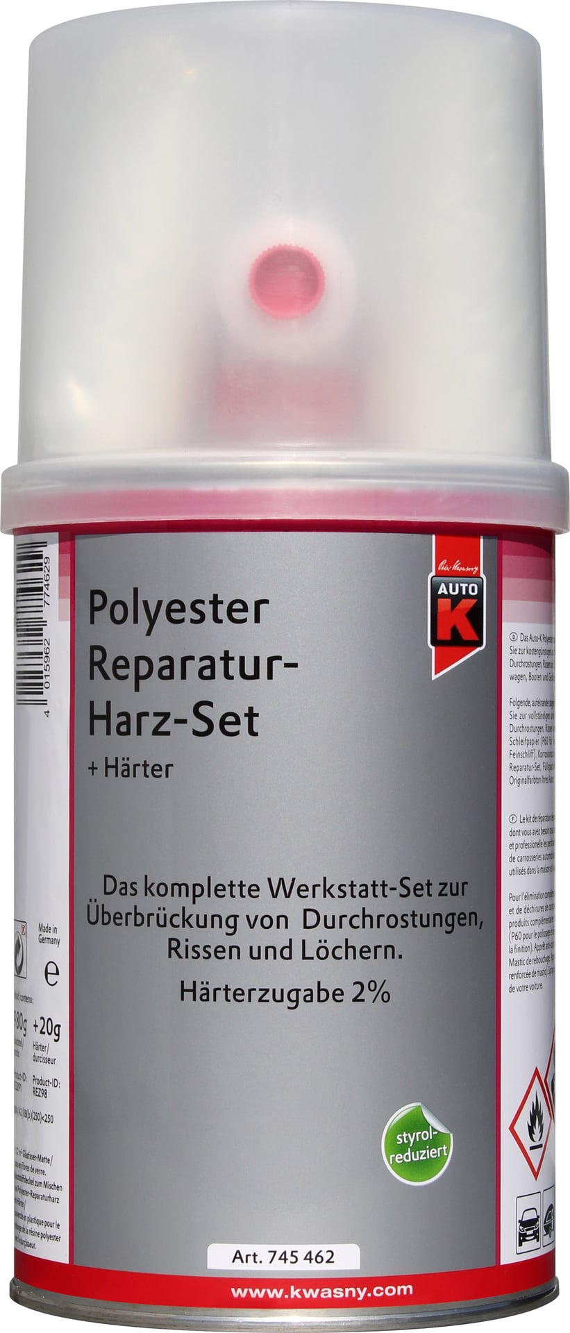 Auto-K POLYESTER-REPARATURHARZ-SET 1000g Auto-K Lackiervorbereitungs-Produkte sind sehr benutzerfreundlich und auch für nicht so geübte Anwender gut einsetzbar. Styrolreduziertes Auto-K Polyester Reparatur-Set, bestehend aus Polyester-Reparaturharz, Härter, Glasfasermatte sowie Kunststoffdeckel zum Mischen von Harz und Härter. Universell einsetzbar im Bereich KFZ, Wohnwagen, Booten, Surfbrettern, Dachrinnen oder Rohren.