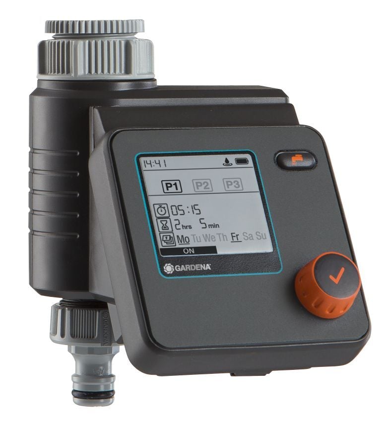 Bewässerungssteuerung Select Mit der GARDENA Bewässerungssteuerung Select lässt sich die Bewässerung flexibel und individuell planen. Für die Bewässerung lassen sich drei unterschiedliche und voneinander unabhängige Zeitpläne erstellen. Einstellbar sind Start, Dauer und Wochentage der Bewässerung. Die Steuerung ist batteriebetrieben, wird direkt an den Wasserhahn angeschlossen und lässt sich leicht durch nur einen Dreh- und Drückschalter zur Auswahl der Daten und zur Bestätigung bedienen. Ein gut lesbares LC-Display zeigt alle Einstellungen auf einen Blick an. ‘Water Now‘ Funktion: Soll die Bewässerung einmal sofort gestartet werden, lässt sich diese manuell aktivieren, ohne das Gerät vom Wasserhahn zu entfernen oder Einstellungen zu verändern. Die Bewässerungssteuerung funktioniert durch die ‘Safe Stop‘ Technologie immer zuverlässig: Ist der Energiestand der Batterie zu gering, um einen Bewässerungsvorgang komplett zu steuern, wird er gar nicht erst gestartet. Die Batterieanzeige im Display weist rechtzeitig darauf hin, wenn die Batterie ausgetauscht werden muss. Die wetterbeständige Bedieneinheit ist abnehmbar. Der Einsatz in Kombination mit einem GARDENA Bodenfeuchtesensor ist möglich.GARDENA gewährleistet höchste Qualität durch die Auszeichnung “Made in Germany”. Dieses Produkt garantiert für eine effiziente Bewässerung, denn jeder Tropfen zählt. – Material: Kunststoff