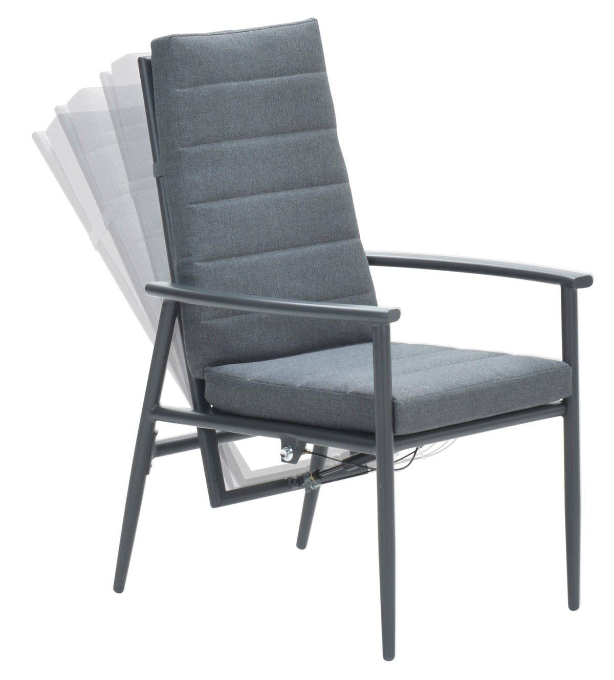 – Farbe Bezug: Mittelgrau, – Gestellfarbe: Dunkelgrau, – Maße: 74,5 x 63 x 103cm, – Material: Aluminium, – mit Armlehnen: Ja, – Stapelbar: Nein, – Stuhlart: Hochlehner, – witterungsbeständig: Ja, – zusammenklappbar: Nein