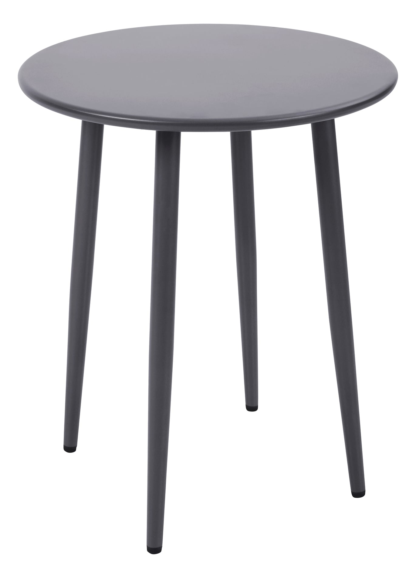 Bistrotisch aus Stahl rund, Oberfläche hellgrau pulverbeschichtet.