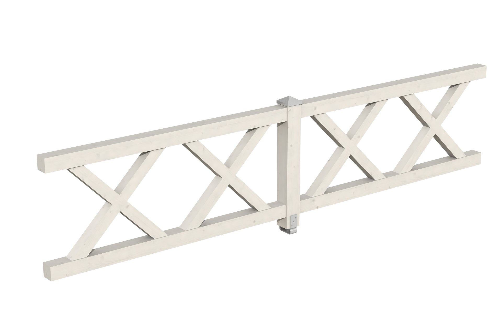 Die dekorative SKAN HOLZ Brüstung mit massiven Andreaskreuzen aus Konstruktionsvollholz eignet sich für SKAN HOLZ Pavillons aus Leimholz mit einem Pfostenabstand von 400 cm.