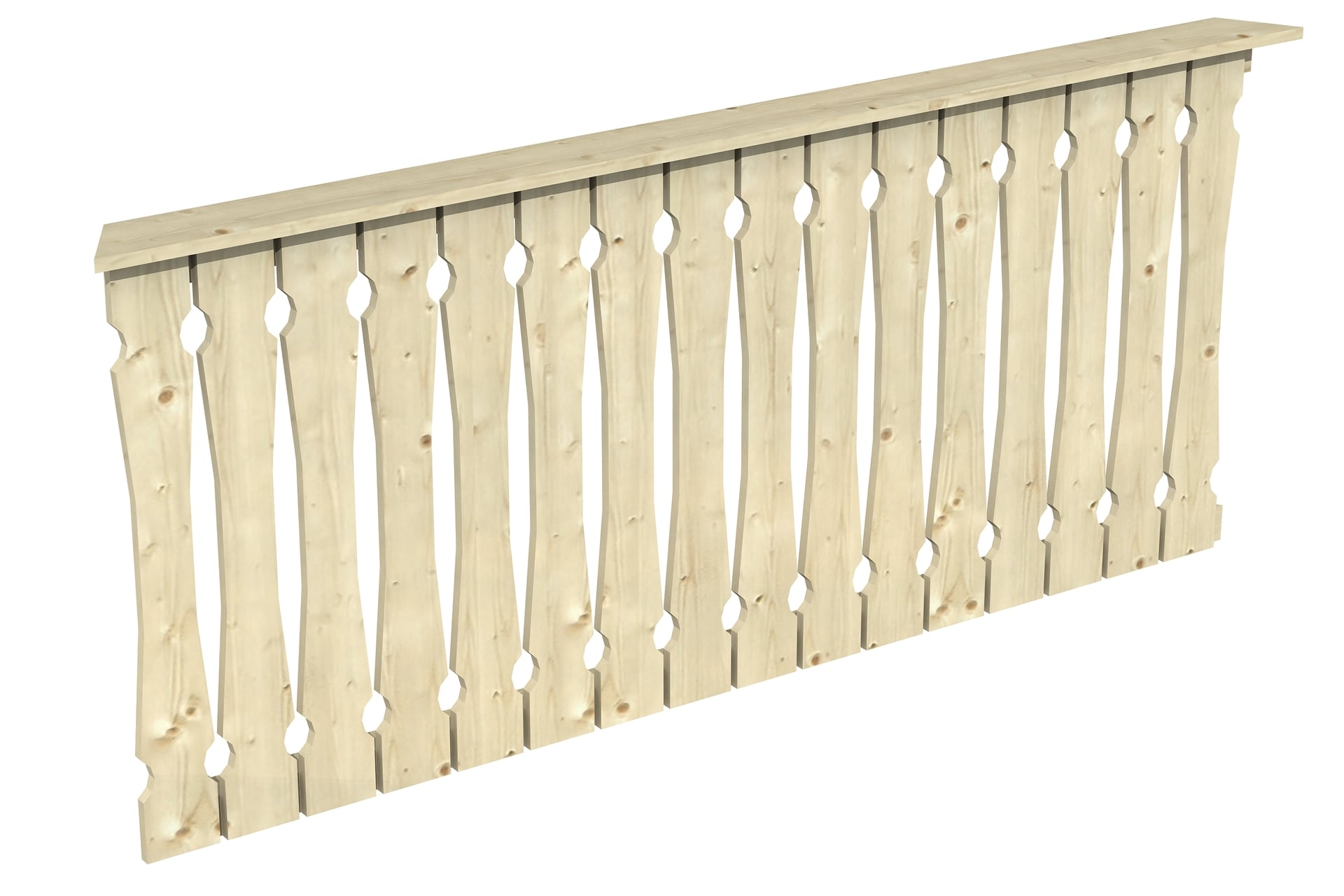 • Breite: 210 cm • Höhe: 96 cm • Stärke Querriegel: 6 x 6 cm • Stärke Balkonbrett: 1,9 x 12 cm • Material: Nordische Fichte • Farblich unbehandelt