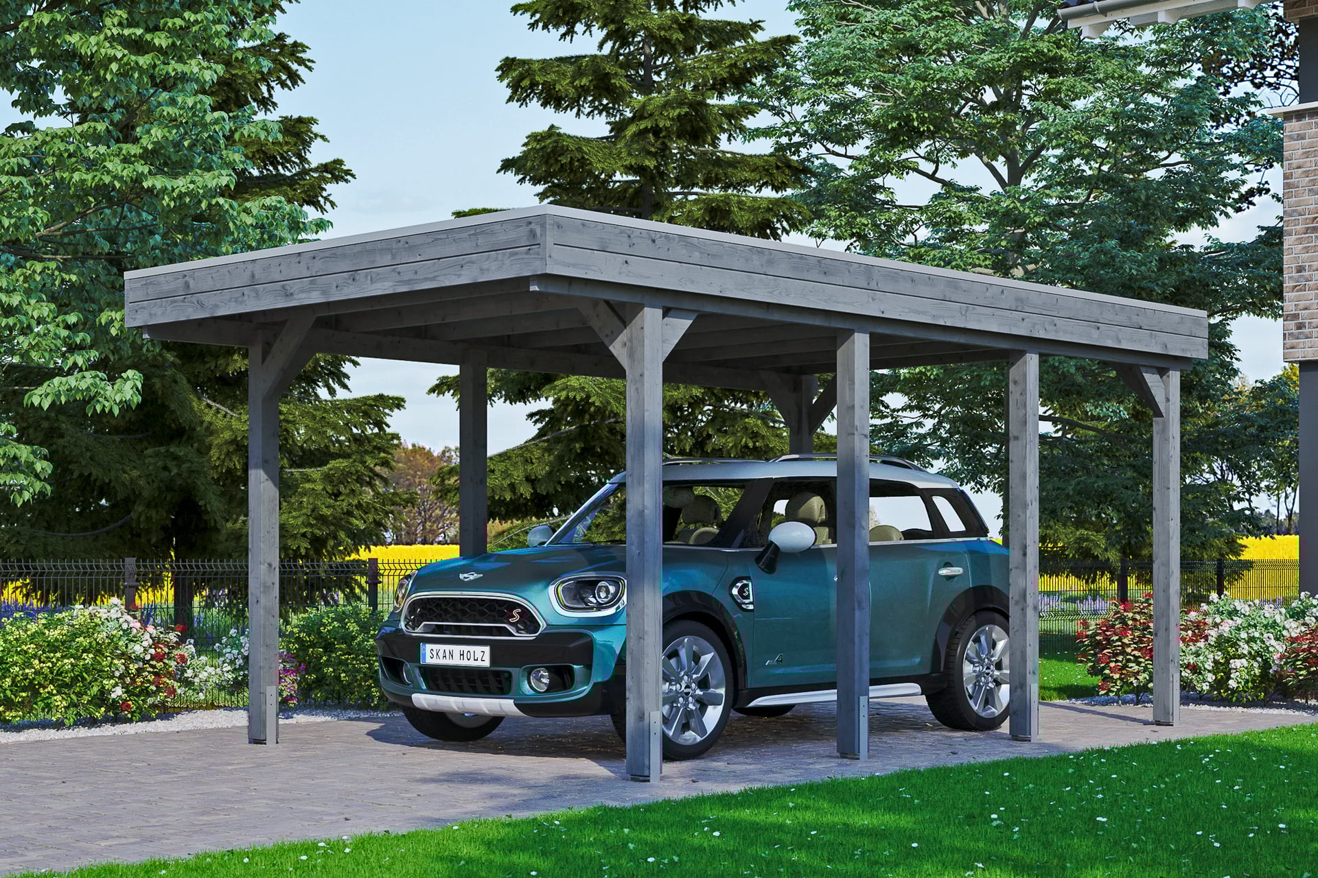• Flachdach-Carport • Außenmaße 314 x 555 cm • Konstruktion aus imprägniertem Nadelholz • farblich behandelt in schiefergrau • Pfosten 11,5 x 11,5 cm inkl. H-Pfostenankern • Dacheindeckung aus 20 mm starker Dachschalung mit EPDM-Folie • Dachabschluss aus einer Profilholzblende mit Aluminium-Abschlusskante