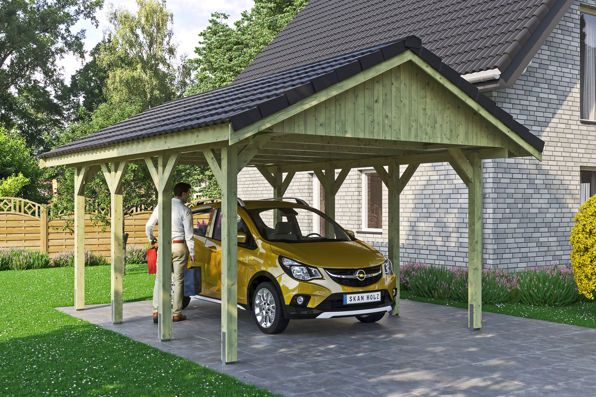 • Satteldach-Carport • Außenmaße 430 x 600 cm • Konstruktion aus imprägniertem Nadelholz • Grün imprägniert • Pfosten 11,5 x 11,5 cm inkl. H-Pfostenankern • Sparrendach mit 38 x 57 mm Dachlatten
