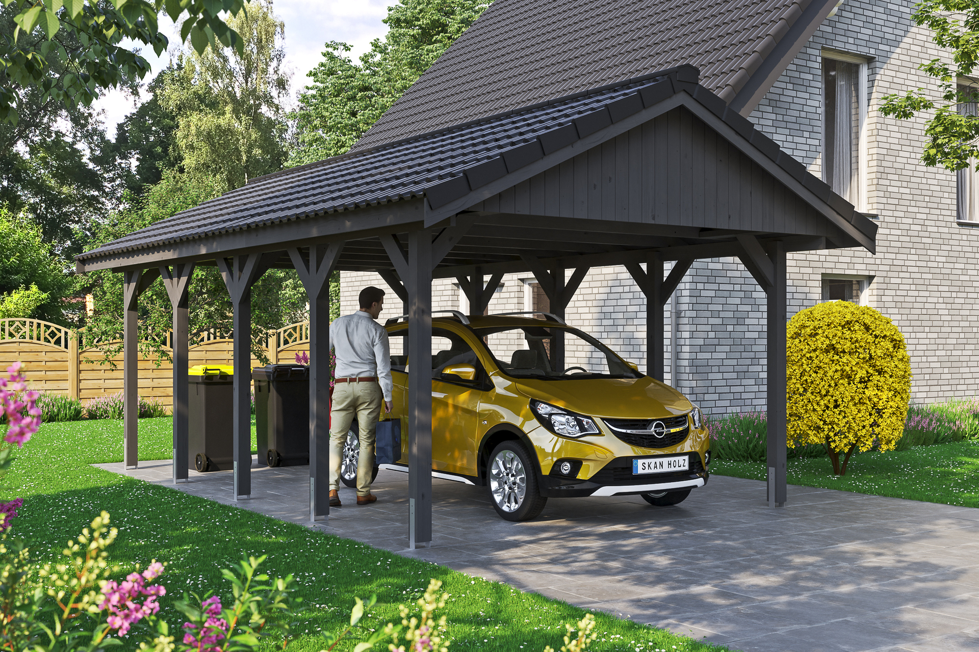 • Satteldach-Carport • Außenmaße 430 x 750 cm • Konstruktion aus imprägniertem Nadelholz • farblich behandelt in schiefergrau • Pfosten 11,5 x 11,5 cm inkl. H-Pfostenankern • Sparrendach mit 38 x 57 mm Dachlatten