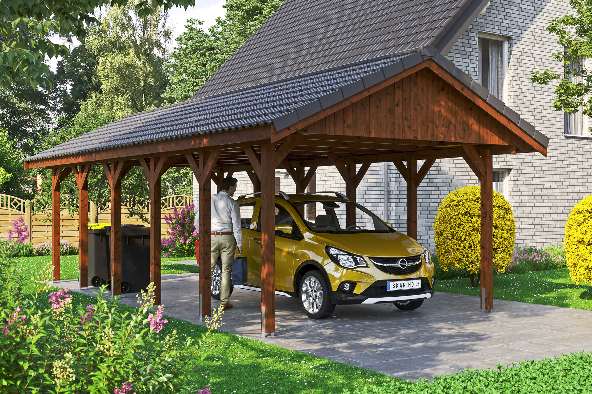 • Satteldach-Carport • Außenmaße 430 x 900 cm • Konstruktion aus imprägniertem Nadelholz • farblich behandelt in nussbaum • Pfosten 11,5 x 11,5 cm inkl. H-Pfostenankern • Sparrendach mit 38 x 57 mm Dachlatten
