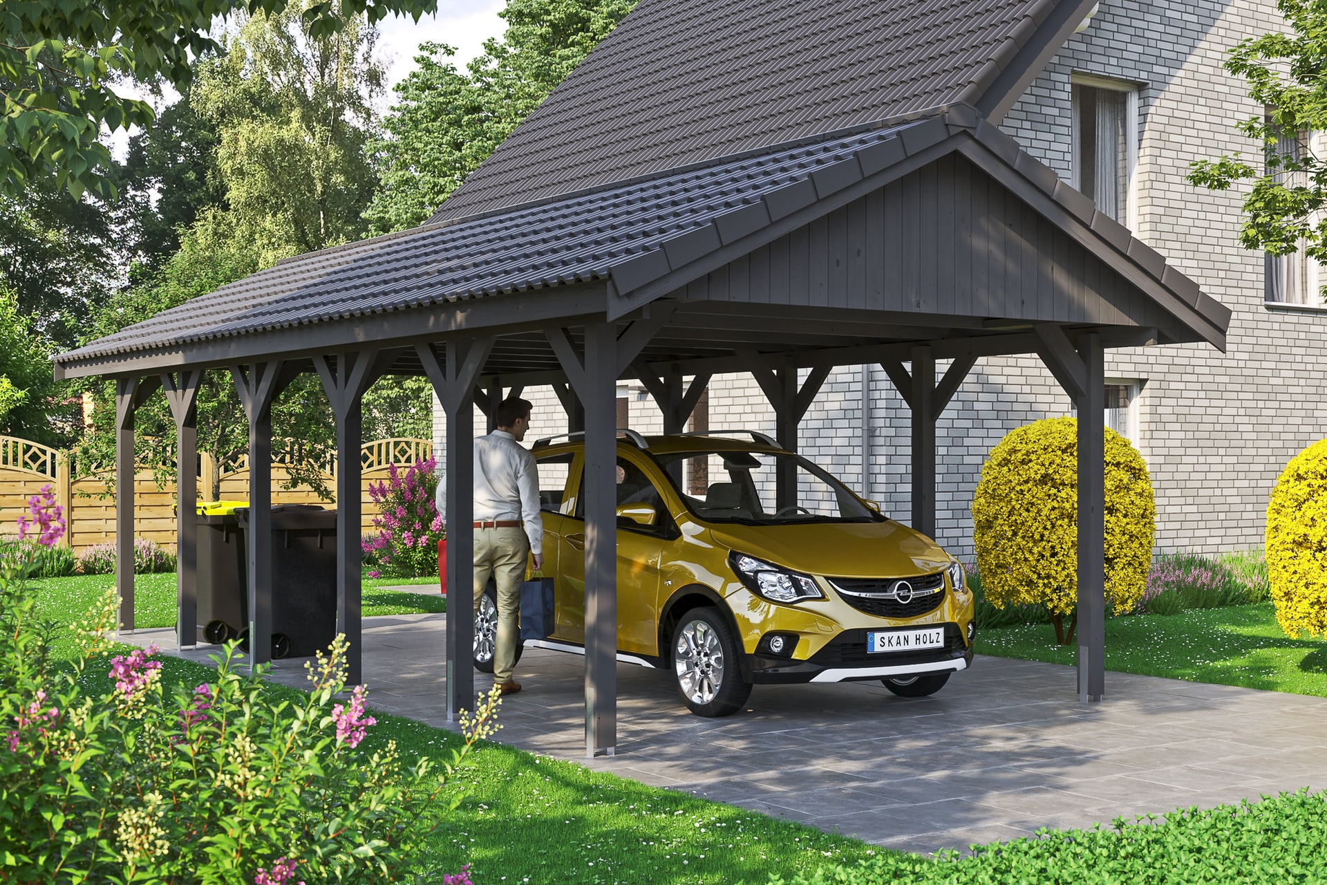 • Satteldach-Carport • Außenmaße 430 x 900 cm • Konstruktion aus imprägniertem Nadelholz • farblich behandelt in schiefergrau • Pfosten 11,5 x 11,5 cm inkl. H-Pfostenankern • Sparrendach mit 38 x 57 mm Dachlatten