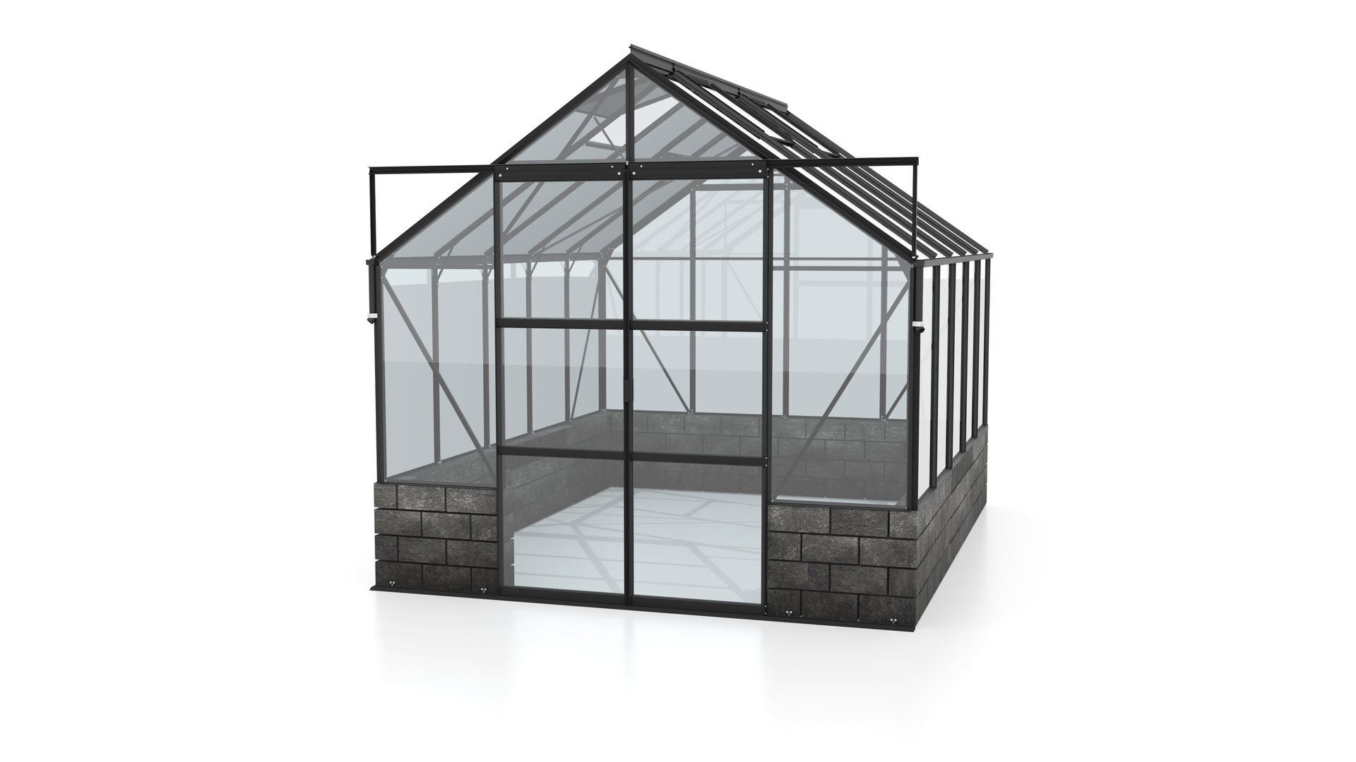 Cassandra ESG3mm So wohnlich kann es im Grünen sein: Auf einem soliden Sockel stehend wird Ihr Gewächshaus schnell zum zweiten Zuhause und bringt dabei ein wenig englischen Stil in Ihren Garten. Das Cassandra hebt sich durch einen gemauerten Sockel vom klassischen, vollverglasten Gewächshaus ab: Der diskrete Sichtschutz, das freundliche Klima und die solide Gesamterscheinung verleihen dem Gewächshaus eine hohe Wohnlichkeit für viele gemütliche Stunden im eigenen Grün. Der Sockel kann mitbestellt oder nach eigenen Wünschen gestaltet werden. Das Set besteht aus dem Gewächshaus sowie dem Sockelbausatz aus 125 mm tiefen werksteinen. Die Steine sind in zwei Farben, Herbstlaub und Basalt, erhältlich. Leihcte Unregelmäßigkeiten in der Oberfläche und feine Farbnuancen ergeben ein wertiges Mauerbild in Naturstein-Optik. Auch die Pflanzen werden sich im Modell Cassandra wohlfühlen: Das Sicherheitsglas, kristallklar (ESG) lässt ein Maximum an Licht in Ihr Gewächshaus, in dem Gemüse, Obst, Kräuter und Zierpflanzen auf bis zu 11,5 m² und bis zu 2,49 m hoch wachsen dürfen. Jedes Vitavia Gewächshaus ist serienmäßig mit Regenrinnen ausgestattet. Hervorragend be- und entlüftet werden sie durch die vier mitgelieferten Dachfenster. Ob in Aluminium eloxiert oder Schwarz pulverbeschichtet: Dank ihrer Oberflächenbehandlung sind die Profile optimal gegen Korrosion und Verwitterung geschützt. Die kugelgelagerte Doppelschiebetür hat eine bodentiefe Türschwelle, eine Breite von 122 cm und eine Höhe von 194 cm. Sie läuft leichtgängig und bietet so einen komfortablen Zugang auch im Rollstuhl, mit dem Kinderwagen – oder natürlich mit der Schubkarre. – Breite: 257, – Gewicht: 251,35, – Höhe: 248,9, – Länge: 323,1 Gewächshaus, Mauersockel, Montageanleitung