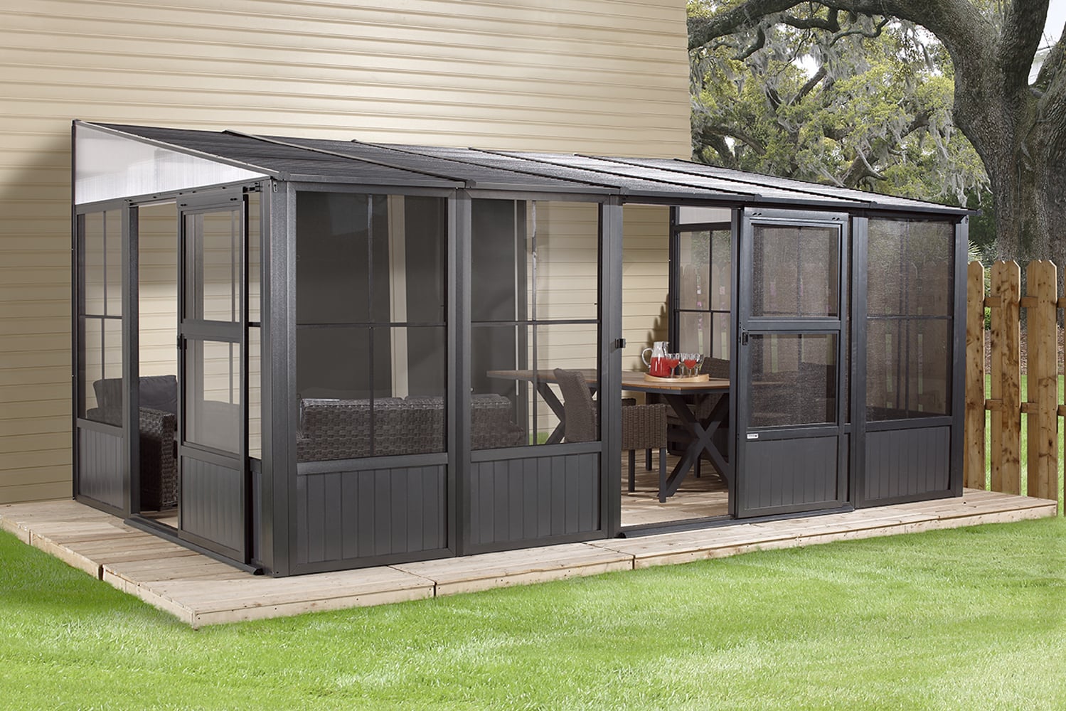 Einfacher Aufbau durch 2 Personen mit Hilfe von handelsüblichen Werkzeugen sowie einer detaillierten Schritt-für-Schritt Anleitung. Als Untergrund empfehlen wir eine ebene Fläche aus Holz, Beton oder Pflastersteinen. Die Schiebetüren können flexibel auf allen Seiten montiert werden. Zu beachten ist, dass je Seite nur eine Tür eingesetzt werden kann. Schraubenkit zur Verankerung am Boden wird nicht mitgeliefert. 5 Jahre Herstellergarantie* (siehe Garantiebestimmung) gegen Durchrostung.