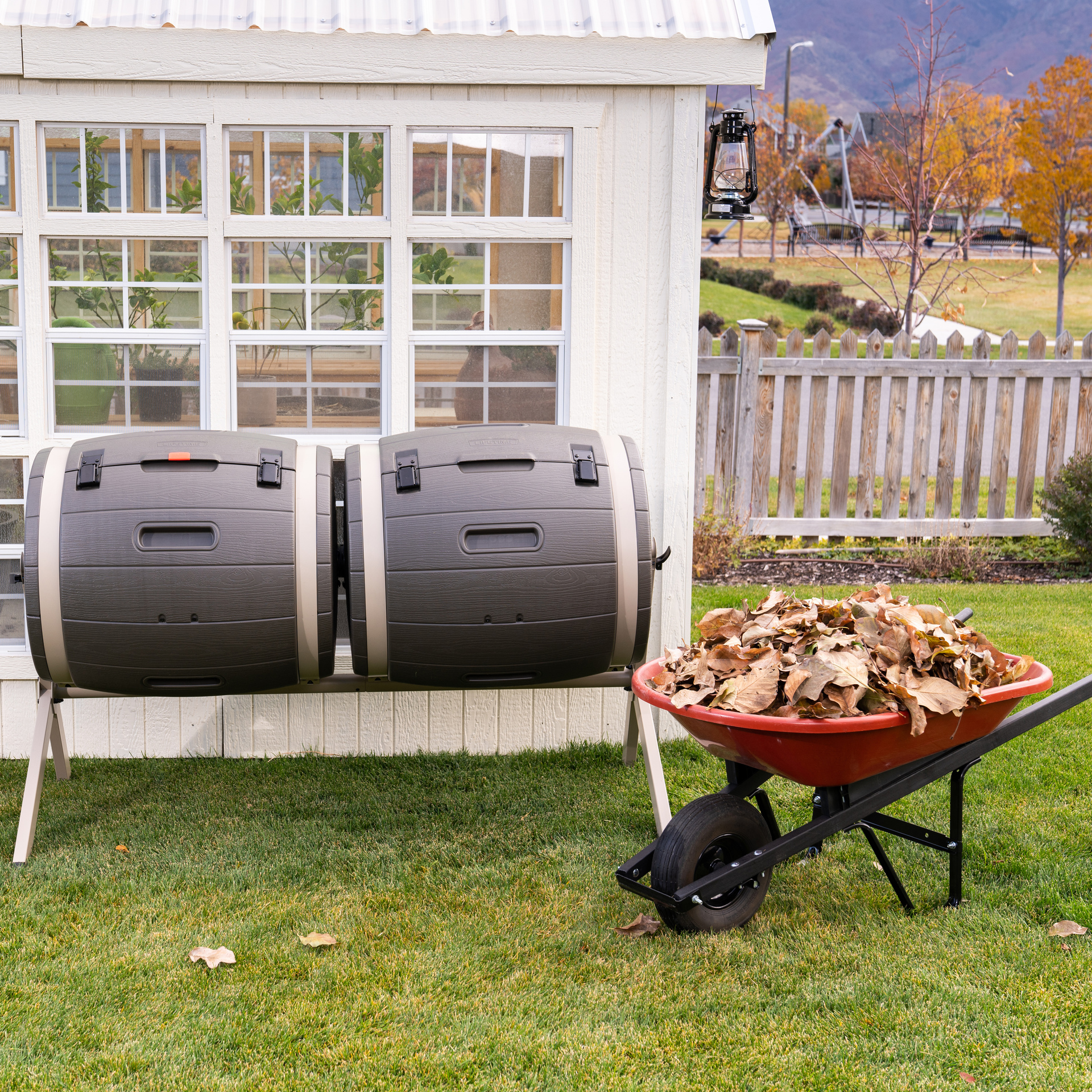 Doppelkomposter Fass 380L Der Premium Komposter “Fass” verwandelt dank ausgeklügelter Technik organische Abfälle aus Küche und Garten schnell, sauber und ohne Gerüche zu Kompost. Kein lästiges Umsetzen mehr! Durch gelegentliches 360°Drehen der in mehrere Positionen verstellbaren Kunststofftrommeln wird das Kompostgut gelockert, verteilt sowie durch eine Zufuhr befeuchtet und mit Luft gemischt. Eine rasche und gleichmäßige Kompostierung ist dadurch gewährleistet. Während dem Rotteprozess in Trommel eins, kann die zweite Trommel weiterhin mit neuem Kompostgut befüllt werden. Bei der doppelwandigen Konstruktion dient die zwischen den Wänden eingeschlossene Luft als wirkungsvolle Isolierschicht. Beste Voraussetzungen also für einen schnellen und intensiven Verrottungsvorgang. Die optimale Arbeitshöhe in Verbindung mit den großen Öffnungsklappen sorgt für einfaches und rückenschonendes Befüllen und Entnehmen. Äußerst stabile und wetterfeste Ausführung aus UV-beständigem und recycelbarem Kunststoff mit pulverbeschichtetem Stahlgestell für sicheren Stand und Schutz vor Nagetieren. Einschließlich genauer Kompostieranleitung geliefert. Leichter Zusammenbau. 5 Jahre Garantie. – Breite: 165, – Gewicht: 35, – Höhe: 109, – Länge: 79, – Material: Kunststoff