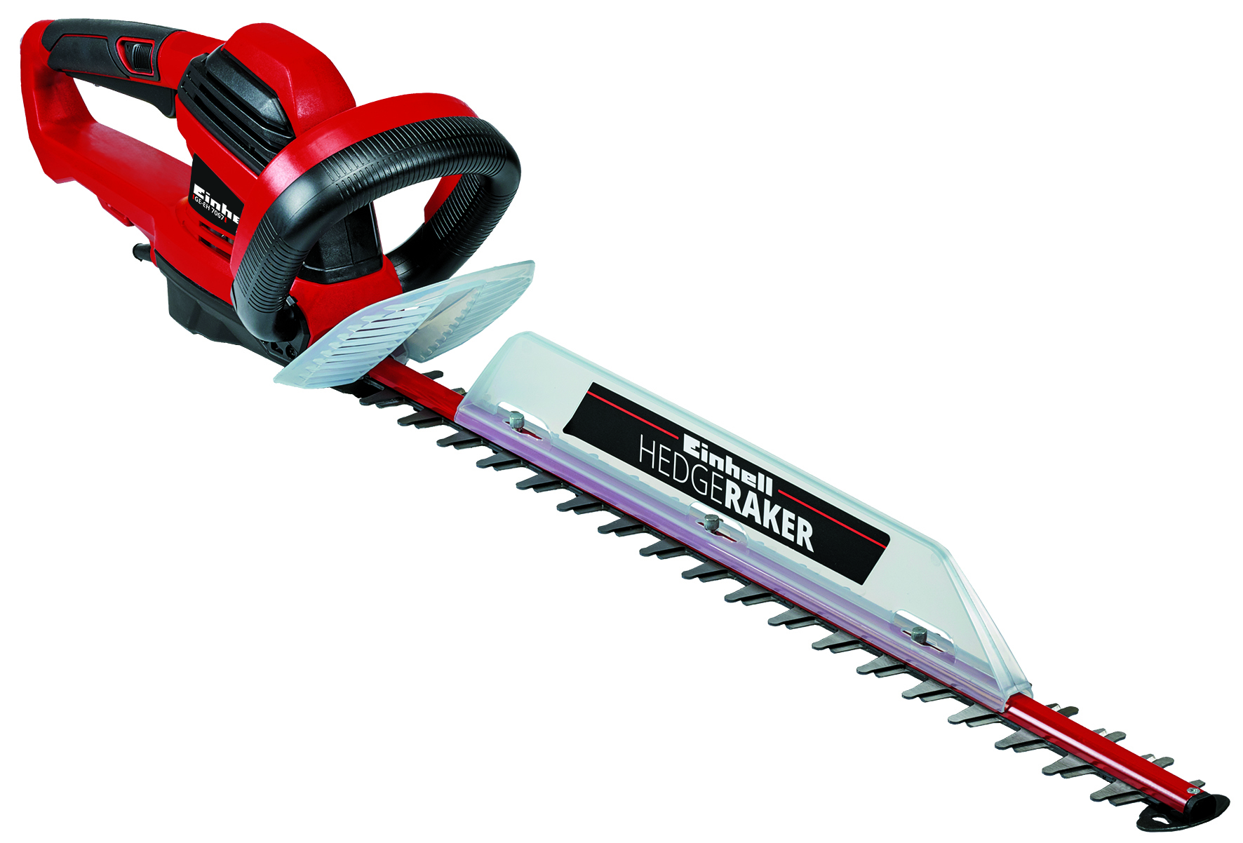 Elektro-Heckenschere GE-EH 7067 mit der Einhell Elektro-Heckenschere GE-EH 7067 ist der Zuschnitt von Hecken, Sträuchern und Gebüsch ein Leichtes. mit einer Schnittlänge von 670mm und 700 W ist sie ein kraftvoller Helfer. Die Messer sind aus lasergeschnittenem und diamantgeschliffenem Stahl. Hohe Lebensdauer garantiert das Metallgetriebe. Der Zusatzhandgriff sorgt für stabilen Halt. Der hintere Handgriff ist drehbar. Sicherheit gibt der Zwei-Hand-Sicherheitsschalter mit Messerstopp unter einer Sekunde. Großflächiger Handschutz, Alu-Messerabdeckung und Stoßschutz sind weitere Vorzüge der Heckenschere. Durch den praktischen Schnittgutsammler lässt sich das Schneidgut bequem von der Heckenoberseite abtragen. Für Transport und Lagerung wird ein stabiler Köcher mitgeliefert.