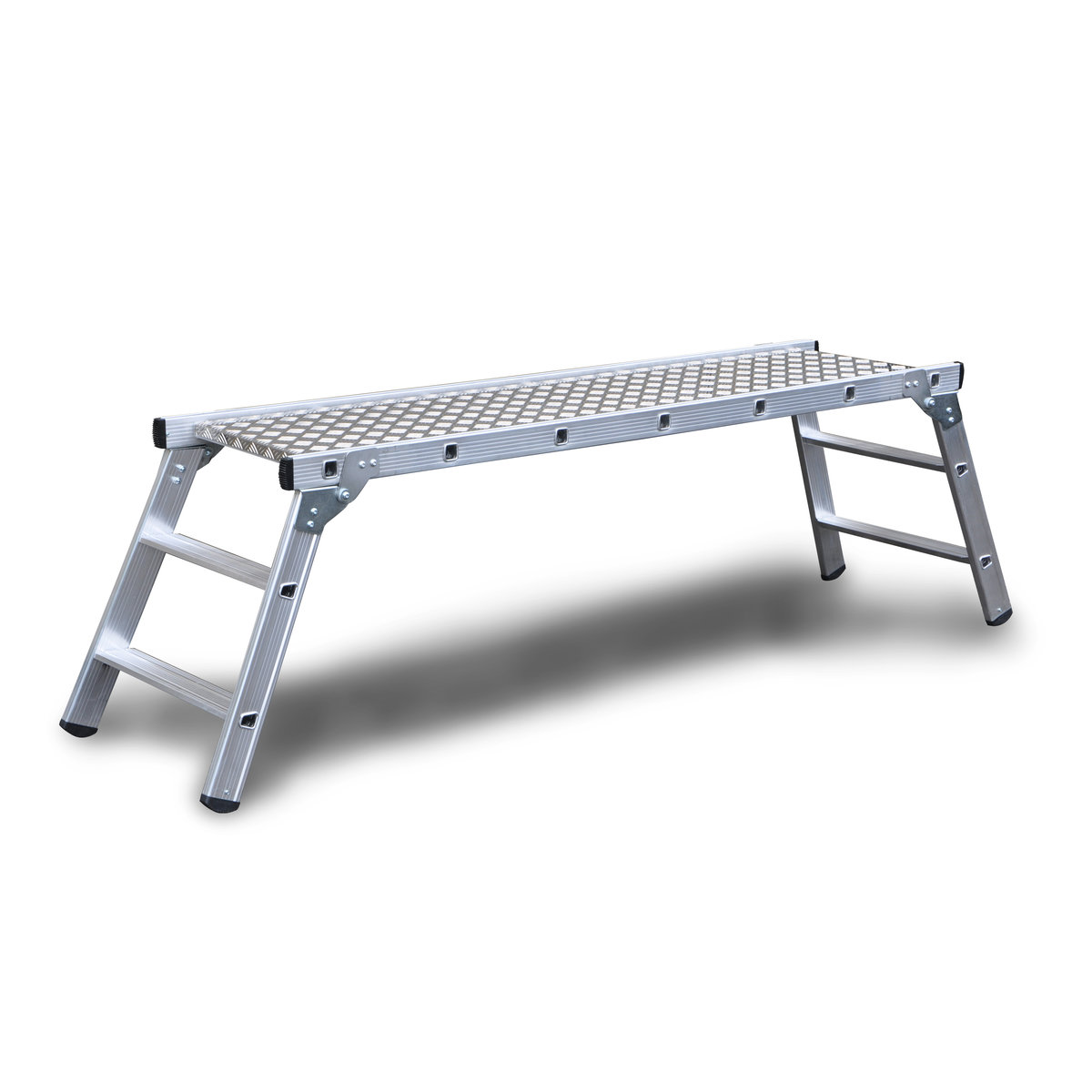 Alu – Arbeitsplattform, klappbar mit Stufeneuroline – der sichere AufstiegDiese Arbeitsplattform aus Aluminium eignet sich besonders gut für Reparaturen oder Montagearbeiten in geringer Höhe. Die große Plattform bietet mit ihren Maßen von 1,71 m x 0,42 m Platz für 2 Personen. Diese können bequem neben einander auf der Fläche stehen. Der Auf- und Abstieg erfolgt über die einklappbaren Leiternteile, welche mit 80 mm tiefen Aluminium -Stufen ausgestattet sind. Alle Beschlagteile sind sehr stabil und für die täglichen Gebrauch ausgelegt. Die Plattform steht auf Kunststoff-Leiterfüßen(rot), die in den Holmenden fest verschraubt sind. Die Standfläche besteht aus einem geriffelten Profil, so dass eine gute Rutschhemmung gegeben ist. Ist die Plattform durch die Außenarbeit sehr stark verschmutzt, kann sie z.B. durch Abfegen auch schnell wieder gereinigt werden. Für den Transport oder die Lage…