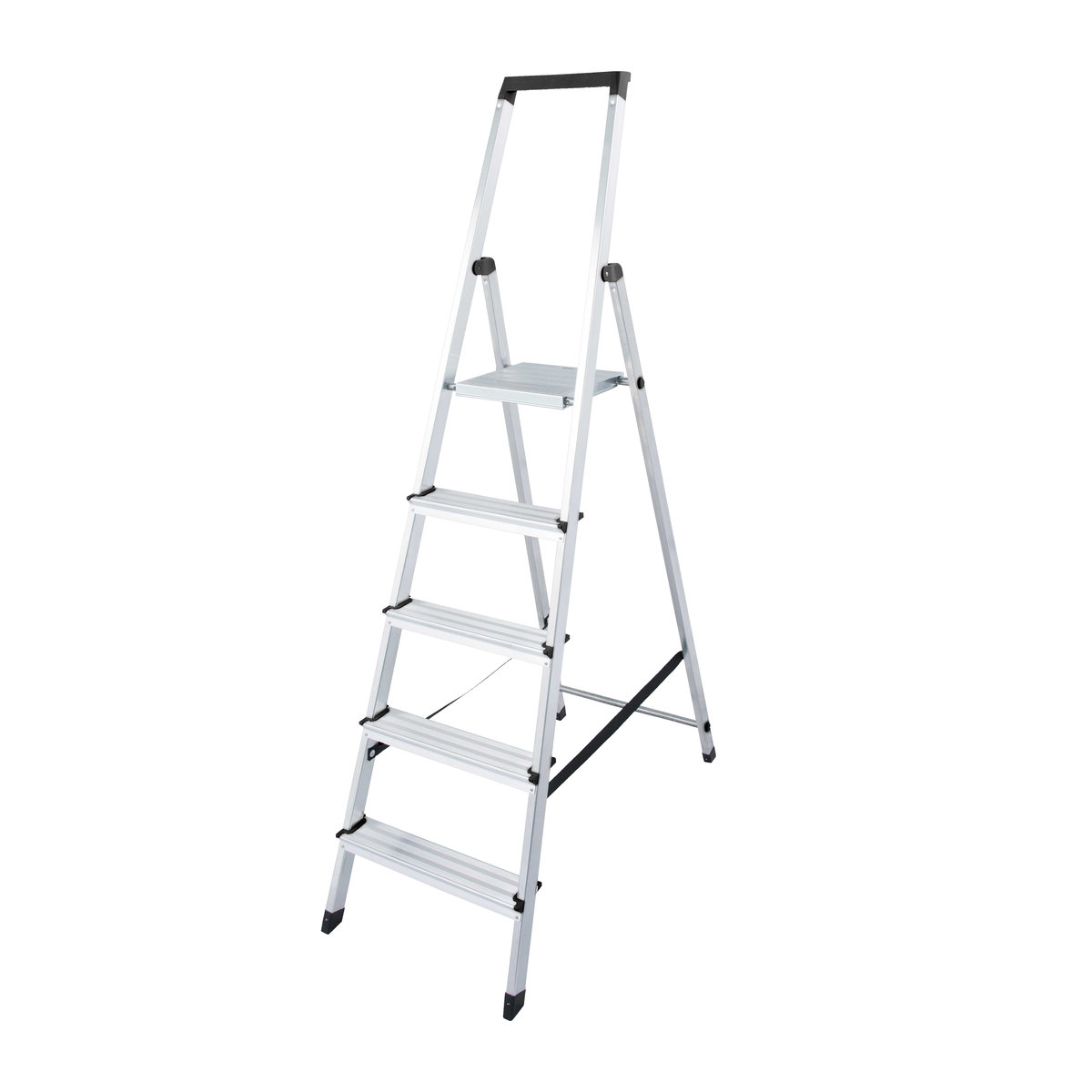 Alu-Haushaltsleiter mit Sicherheitsbrücke und 5 Stufeneuroline – der sichere AufstiegDer kompakte Allrounder für viele unterschiedliche Tätigkeiten imInnenbereich. Der hohe Sicherheitsbügel gibt Ihnen zusätzlicheSicherheit beim Arbeiten auf der Leiter, egal ob beim Fenster putzen,Gardinen aufhängen, Staub wischen oder Regale befüllen. Mit derpraktischen Ablage oben im Sicherheitsbügel sparen Sie sich unnötigesauf- und absteigen. Stufen mit Anti – Rutsch – RiffelungRutschsichere FußkappenAblage für Kleinteile und Eimerhaken im Sicherheitsbügel integriertStabile, vernietete Stufen-/HolmverbindungZusammenklappbarDer Hauptwerkstoff Aluminium kann äußerst ressourcen- undenergieschonend recycelt werden. Produktionsabfälle aus Aluminium werdendirekt im Werk getrennt und wiederverwendet.