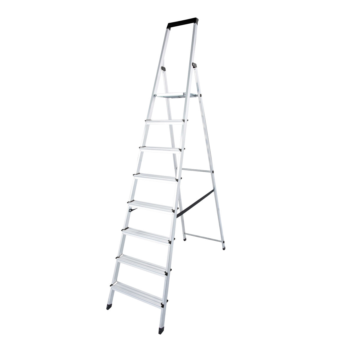Alu-Haushaltsleiter mit Sicherheitsbrücke und 8 Stufeneuroline – der sichere AufstiegDer kompakte Allrounder für viele unterschiedliche Tätigkeiten imInnenbereich. Der hohe Sicherheitsbügel gibt Ihnen zusätzlicheSicherheit beim Arbeiten auf der Leiter, egal ob beim Fenster putzen,Gardinen aufhängen, Staub wischen oder Regale befüllen. Mit derpraktischen Ablage oben im Sicherheitsbügel sparen Sie sich unnötigesauf- und absteigen. Stufen mit Anti – Rutsch – RiffelungRutschsichere FußkappenAblage für Kleinteile und Eimerhaken im Sicherheitsbügel integriertStabile, vernietete Stufen-/HolmverbindungZusammenklappbarDer Hauptwerkstoff Aluminium kann äußerst ressourcen- undenergieschonend recycelt werden. Produktionsabfälle aus Aluminium werdendirekt im Werk getrennt und wiederverwendet.