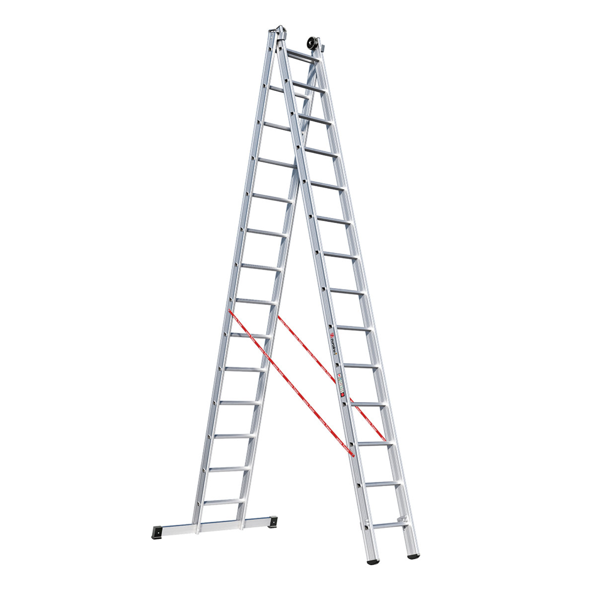 Alu-Mehrzweckleiter 2-teilig mit 2×14 Sprosseneuroline – der sichere AufstiegDie 2-teilige Mehrzweckleiter ideal für Betrieb und Lager sowie Haus und Garten. Mit wenigen Handgriffen kann diese Leiter als Schiebeleiter oder Stehleiter verwendet werden. Die Einsatzmöglichkeiten der 2-teiligen Mehrzweckleiter sind vielseitig, deshalb wird sie gerne auch Vielzweckleiter genannt. Breite Quertraversen sorgen für einen sicheren Stand. Verwendbar als 2-teilige Schiebe- und StehleiterWandlaufrollen (Ø 100 mm) mit wandschonender Lauffläche ab Größe 2x12Spreizsicherung durch 2 reisfeste Sicherheitsspanngurte (25 mm breit)Steckhaken mit SicherungBreite Quertraverse für sicheren StandIm euroline PREMIUM-Line Programm finden Sie ausschließlich Steigtechnik-Profi-Lösungen für die höchsten Ansprüche und starke Belastungen. Die Holme aus starken Aluminiumprofilen für sehr hohe Stabilität übertreffen d…